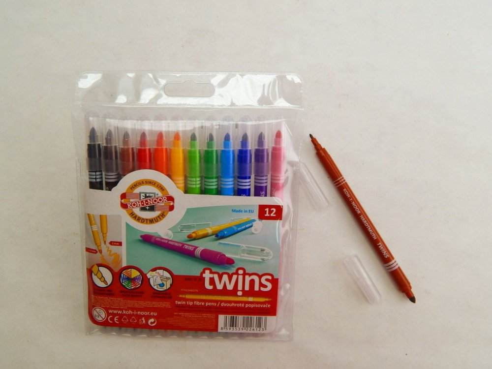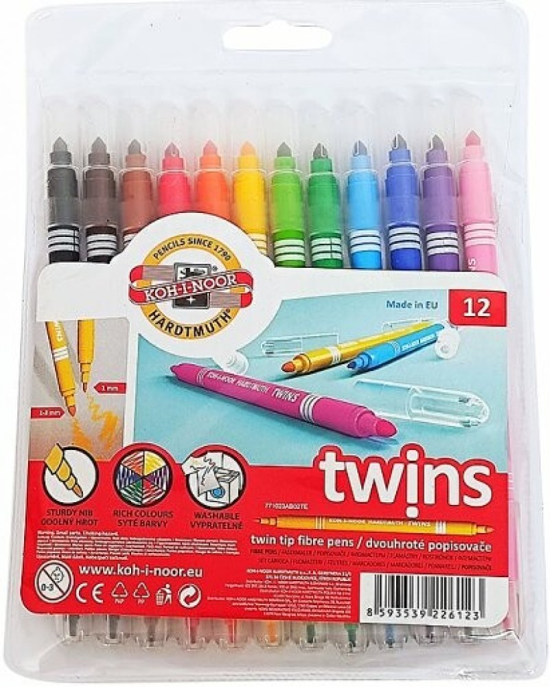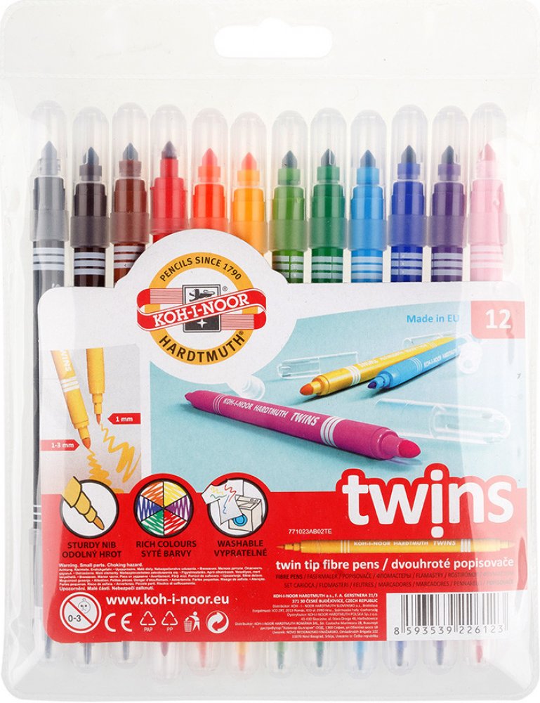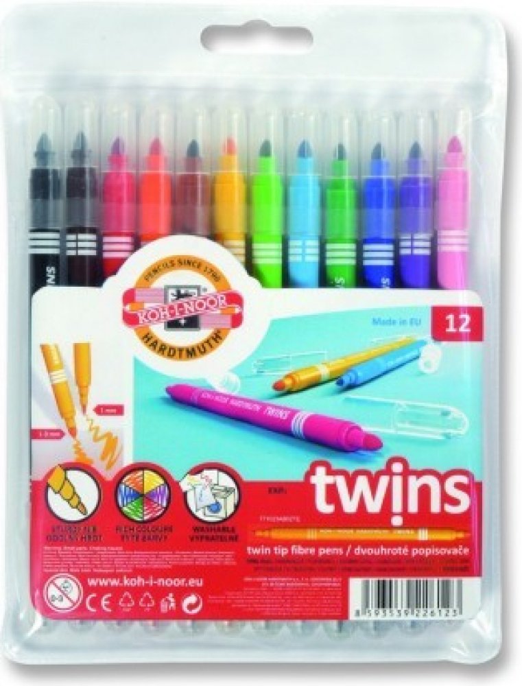 souprava popisovačů 1023 12 TWIN - dvouhrotý fix Školní dvojité popisovače se dvěma různými průměry hrotů a bezpečnostními chránítky,které umožňuje dýchání i v případě spolknutí. Jsou plněné pestrými vypratelnými inkousty ve 12 odstínech a vyrobeny z materiálů zajišťující odolnost proti vyschnutí minimálně 3 roky.Oba hroty jsou odolné proti zatlačení.Umožňují psát a malovat stopou šířky 1 mm, s hrotem průměru 2 mm a 2 – 3 mm s kuželovým hrotem průměru 3,7mm,délka 300 – 600 m podle použitého hrotu.Všechny použité materiály splňují požadavky normy EN – 71.Baleny jsou do souprav po 6 a 12 ks v PP pouzdrech. Vyrobeno v EU.