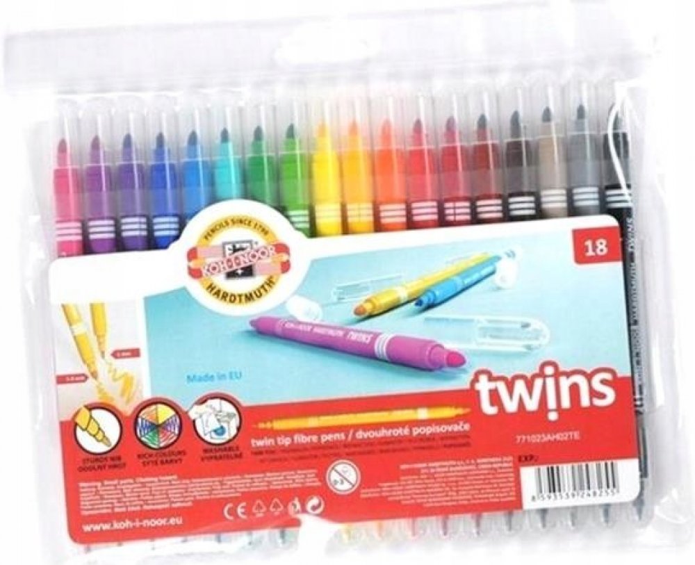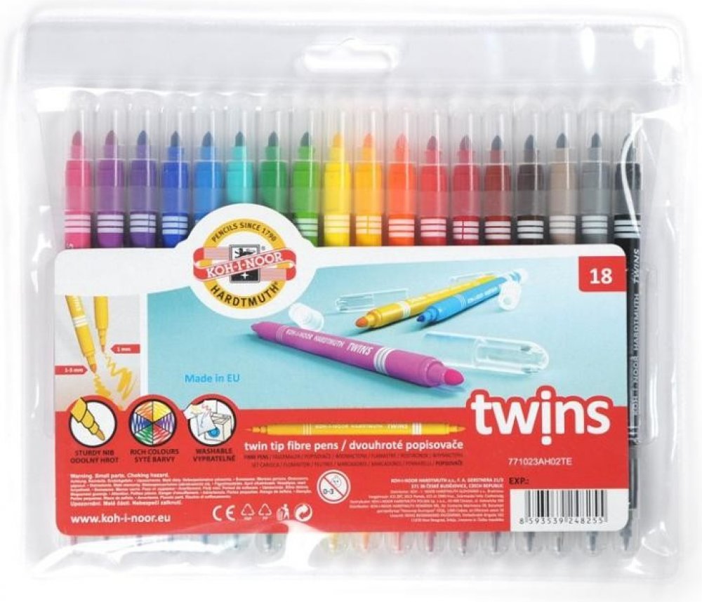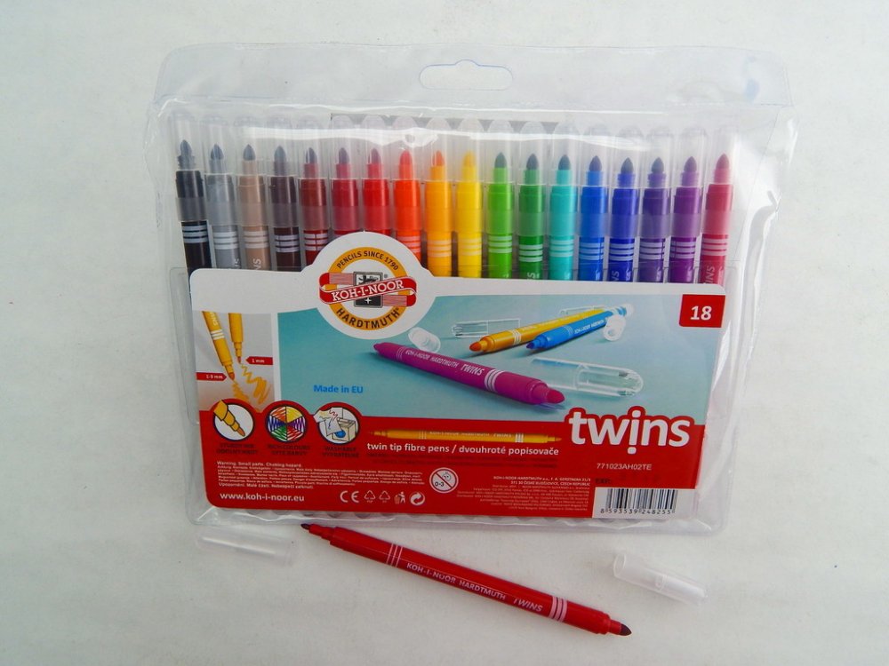 Školní dvojité popisovače se dvěma různými průměry hrotů a bezpečnostními chránítky,které umožňuje dýchání i v případě spolknutí. Jsou plněné pestrými vypratelnými inkousty ve 12 odstínech a vyrobeny z materiálů zajišťující odolnost proti vyschnutí minimálně 3 roky.Oba hroty jsou odolné proti zatlačení.Umožňují psát a malovat stopou šířky 1 mm, s hrotem průměru 2 mm a 2 – 3 mm s kuželovým hrotem průměru 3,7mm,délka 300 – 600 m podle použitého hrotu.Všechny použité materiály splňují požadavky normy EN – 71.Baleny jsou do souprav po 6 a 12 ks v PP pouzdrech. Vyrobeno v EU.