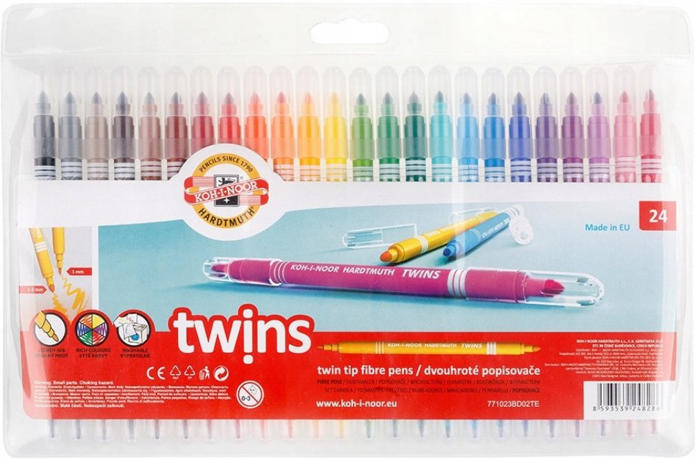 souprava popisovačů 1023 24 TWIN - dvouhrotý fix Školní dvojité popisovače se dvěma různými průměry hrotů a bezpečnostními chránítky,které umožňuje dýchání i v případě spolknutí. Jsou plněné pestrými vypratelnými inkousty ve 12 odstínech a vyrobeny z materiálů zajišťující odolnost proti vyschnutí minimálně 3 roky.Oba hroty jsou odolné proti zatlačení.Umožňují psát a malovat stopou šířky 1 mm, s hrotem průměru 2 mm a 2 – 3 mm s kuželovým hrotem průměru 3,7mm,délka 300 – 600 m podle použitého hrotu.Všechny použité materiály splňují požadavky normy EN – 71.Baleny jsou do souprav po 6 a 12 ks v PP pouzdrech. Vyrobeno v EU.