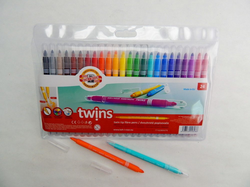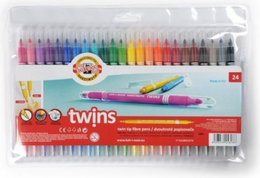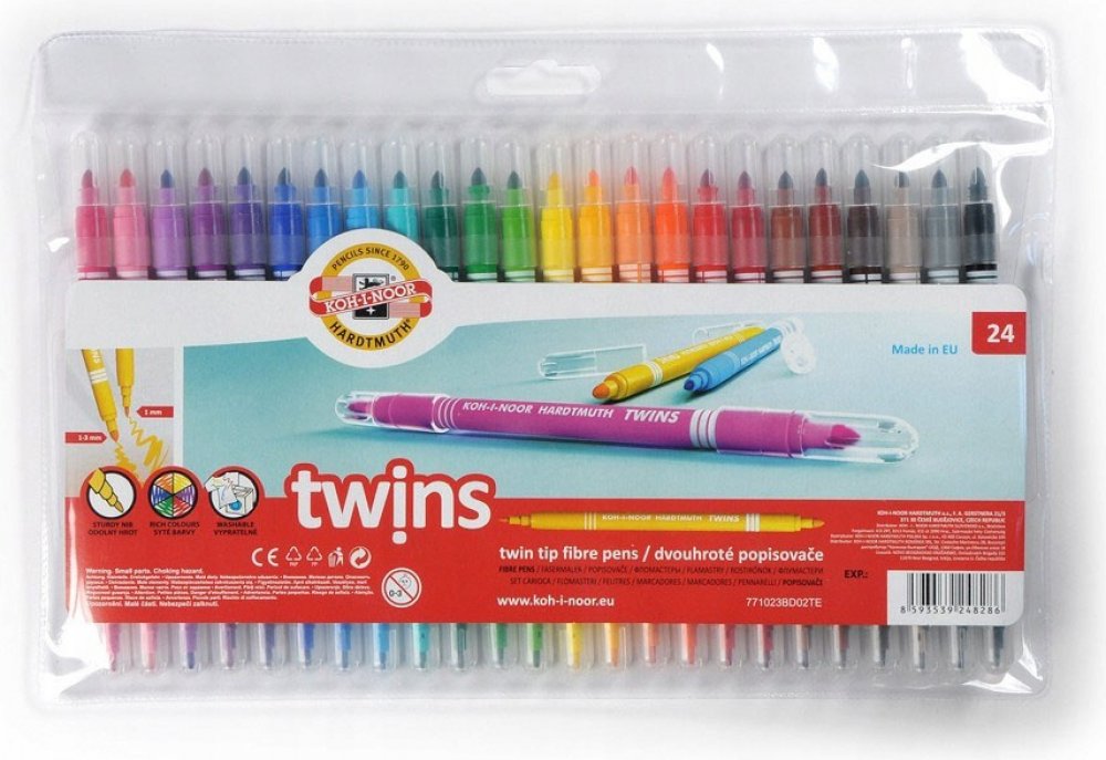 souprava popisovačů 1023 24 TWIN - dvouhrotý fix Školní dvojité popisovače se dvěma různými průměry hrotů a bezpečnostními chránítky,které umožňuje dýchání i v případě spolknutí. Jsou plněné pestrými vypratelnými inkousty ve 12 odstínech a vyrobeny z materiálů zajišťující odolnost proti vyschnutí minimálně 3 roky.Oba hroty jsou odolné proti zatlačení.Umožňují psát a malovat stopou šířky 1 mm, s hr...