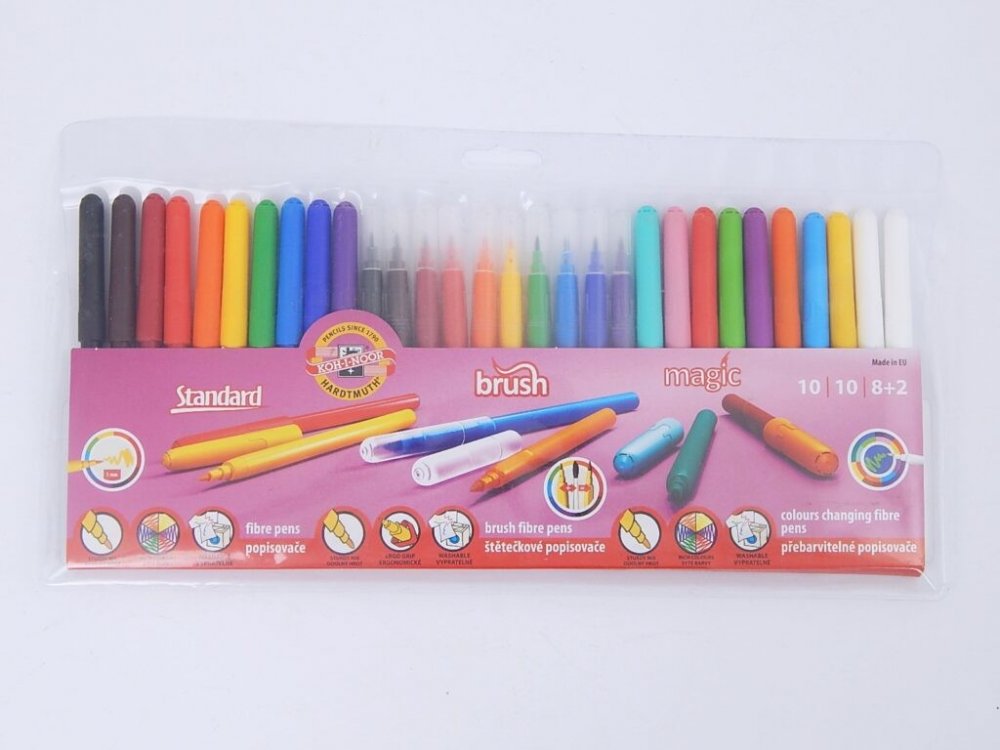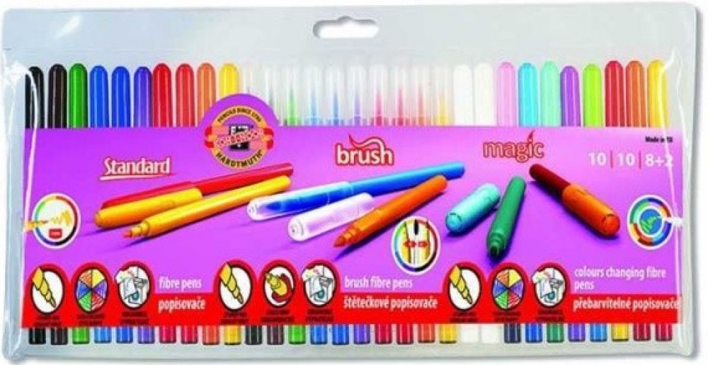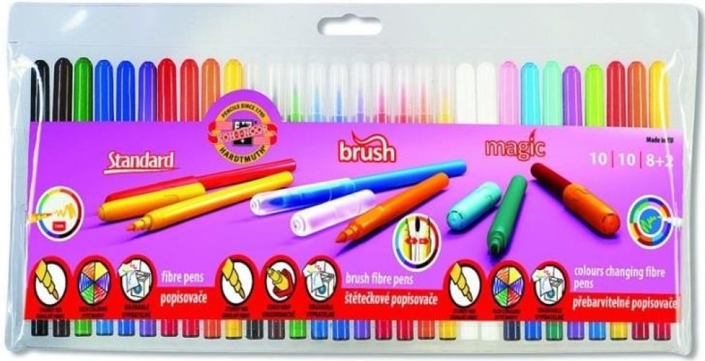 Souprava je sestavená ze tři různých typů popisovačů s bezpečnostním chránítkem,které umožňuje dýchání i v případě spolknutí.Součástí jsou popisovače s vypratelným inkoustem se stopou písma 1 – 2 mm v 10 odstínech, 8 odstínů popisovačů s inkousty přebarvitelnými zmizíkem + 2 zmizíky,celkem 8 + 2, se stopou písma 1 – 2 mm a 10 odstínů popisovačů s vypratelným inkoustem osazených štětcovým hrotem se stopou 1 – 3 mm,délka 600 m,u štětcových hrotů 300 m. Všechny použité materiály splňují požadavky normy EN – 71. Baleny jsou do 30 ks PP pouzdra. Vyrobeno v EU.