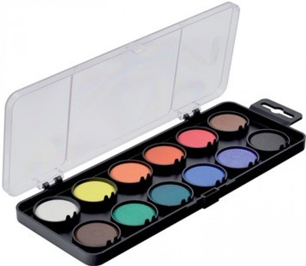 Klasické vodové barvy v soupravě po 12 odstínech. Mají jasné a syté barvy. Velikost tablet je 30 mm v průměru.