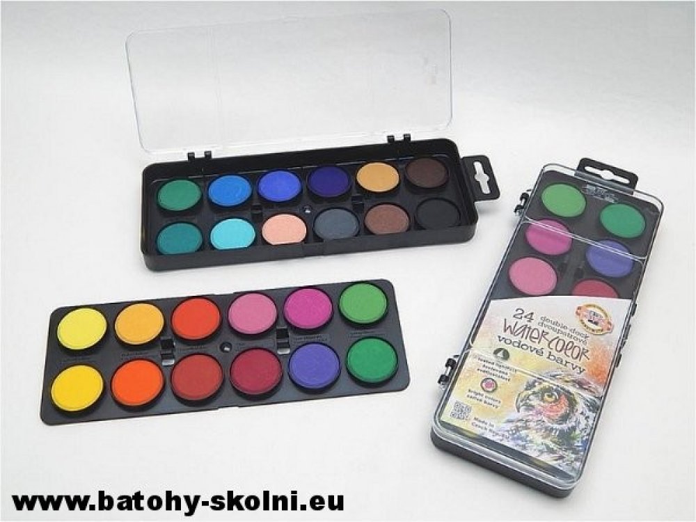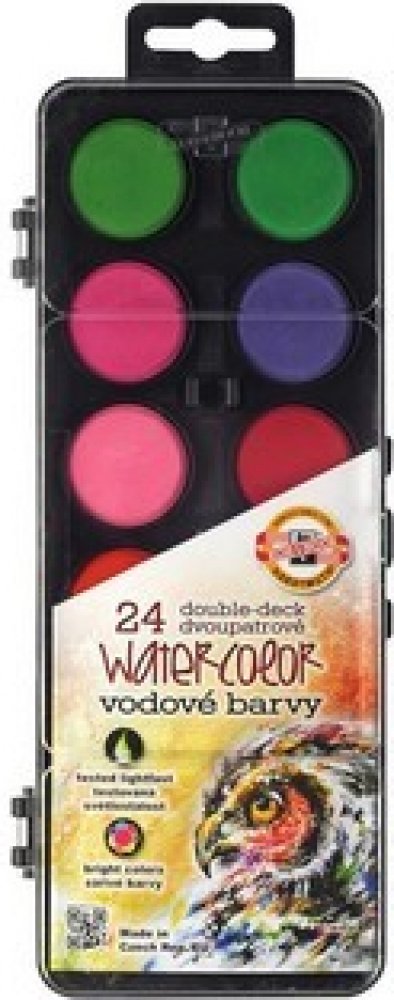 Školní vodové barvy lidově vodovky dvoupatrové. 24 barev v plastové uzavíratelné krabičce. Průměr barviček 30 mm. Pozor tentokrát 24 škála barev. Dvě platíčka barev na sobě, lehce rozebiratelné, lehce skádatelné.