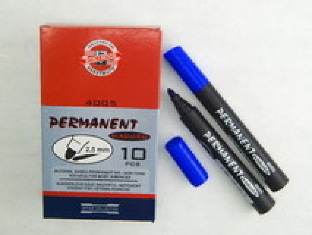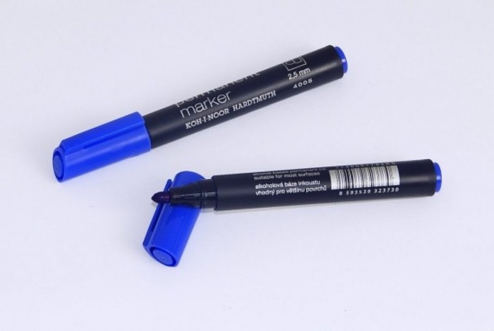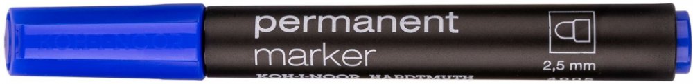 KOH-I-NOOR popisovač permanentí modrý kulatý - klínový hrot - šíře stopy 2,5mm, délka 600m - písmo odolné otěru, vodě a povětrnostním vlivům - vhodné pro materiáli jako kov, sklo, porcelán, plast, kůže, dřevo, beton, kámen, lepenku a kartón - lze smýt lihem