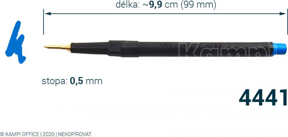Klasická modře píšící velkoobsahová kuličková psací vložka. Určená k výměně do tužek za náplň stejného typu, nebo náplň 4442. Průměr kuličky 0,8 mm. Minimální délka psací stopy je 5000 metrů. Určená pro použití ve škole i v kanceláři. Bez spotřebitelského obalu.