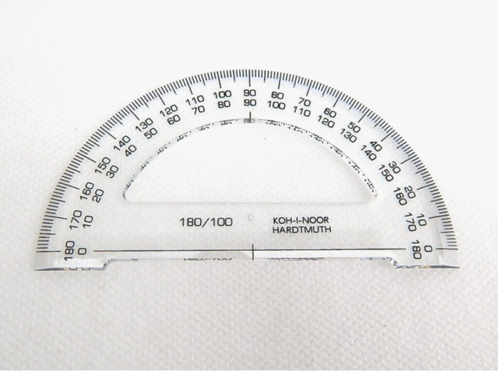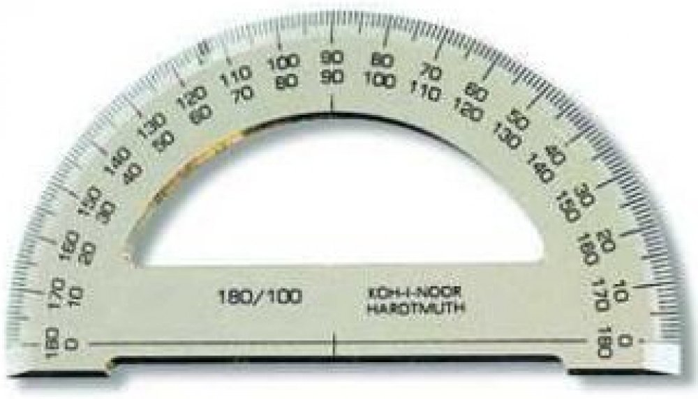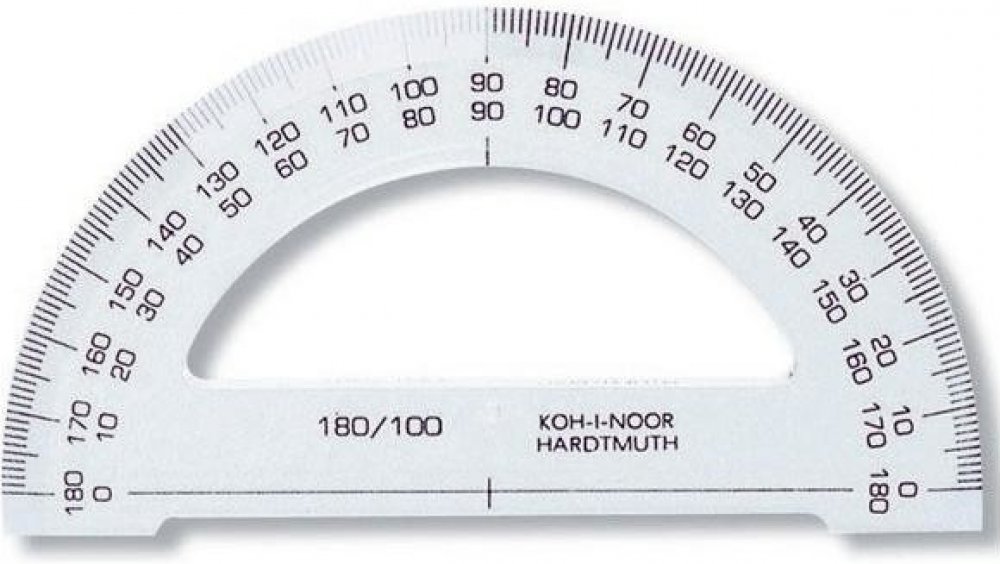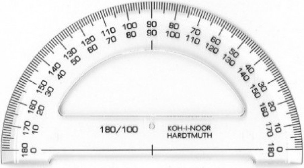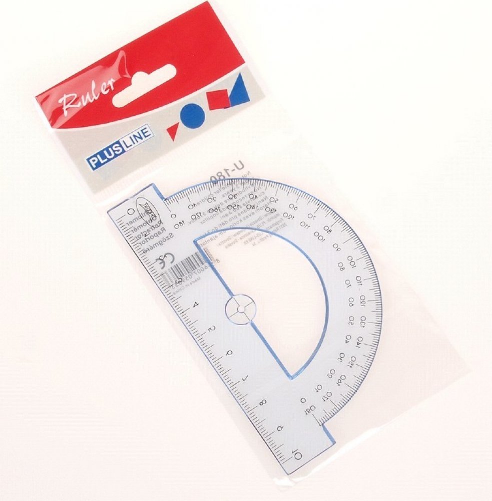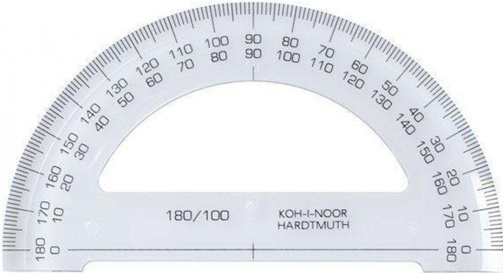 Úhloměr 180/100 746168 transparentní. Úhloměr 180/100 vyrobený z čirého průhledného polystyrenu. Dvě úhloměrné stupnice na oblouku jsou tištěny technologií přesného sítotisku. Tisk stupnic je odolný proti opotřebení při běžném používání. Úhloměr je určený k rýsování a technickému kreslení ve škole i v kanceláři. Zabalen je do polyetylenového sáčku s eurozávěsem.