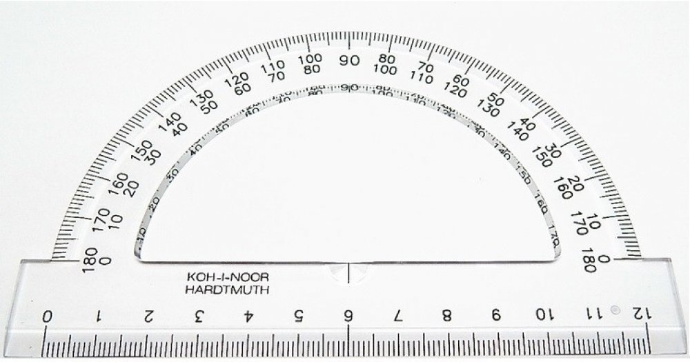 Úhloměr 180/125 vyrobený z čirého průhledného polystyrenu, stupnice tištěny technologií přesného sítotisku, tisk stupnic je odolný proti opotřebení při běžném používán, mimo dvou úhloměrných stupnic na oblouku je na přeponě natištěna 120 mm dlouhá délková stupnice, úhloměr je určený k rýsování a technickému kreslení ve škole i v kanceláři.