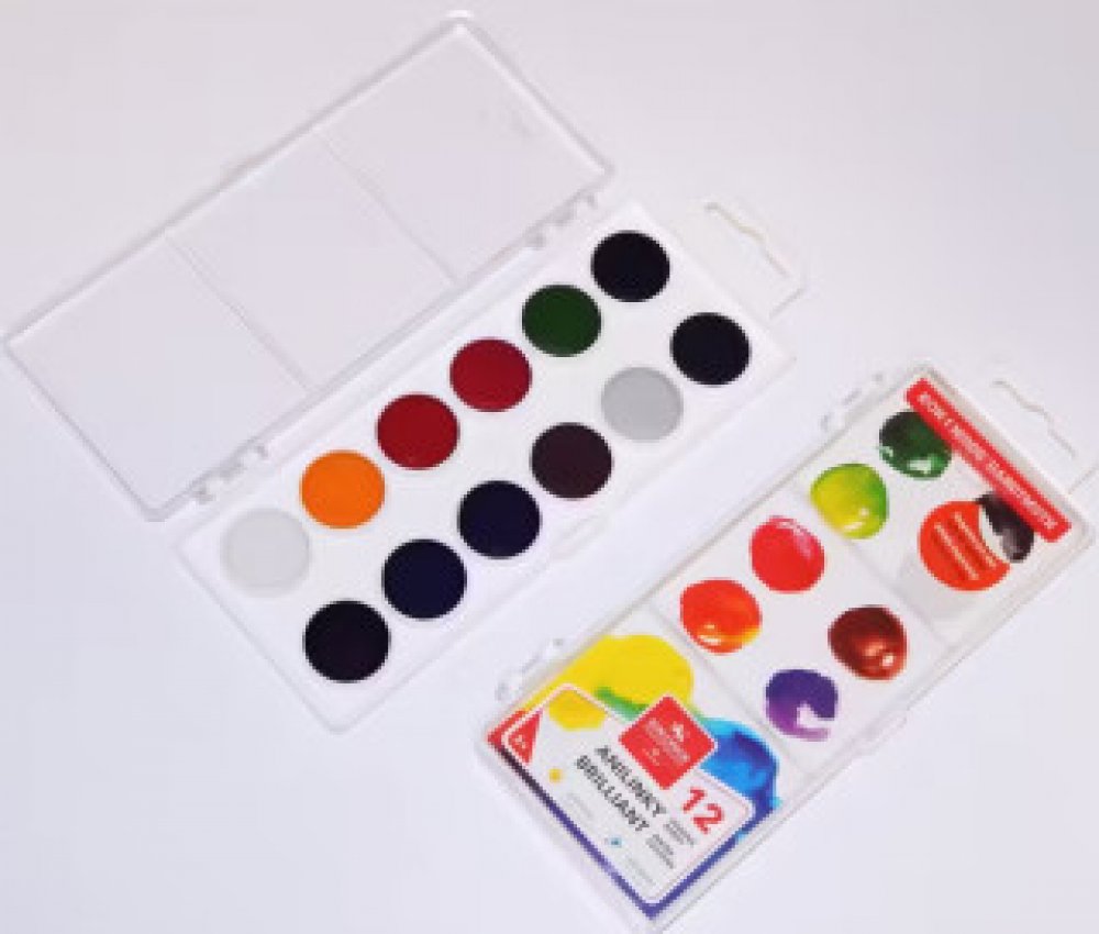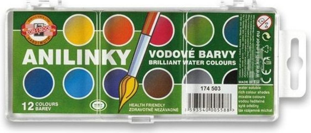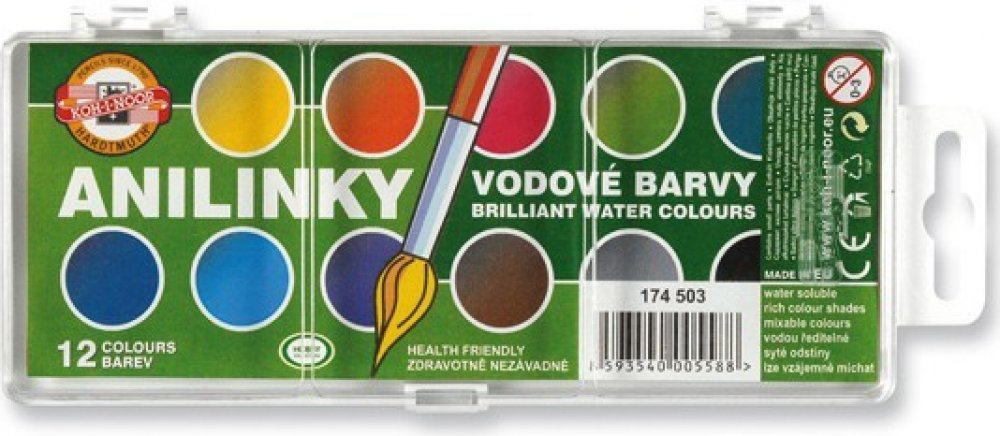 Koh-i-noor Vodové anilinové barvy 12 barev Vodové barvy o průměru tablet 22,5 mm s 12ti brilantními odstíny vhodné pro speciální výtvarné techniky, např. pro kolorování fotografií, malby portrétů, malbě na dekorační předměty, zdobení kraslic aj.. Vložené v plastovém barevníku s transparentním víčkem. z kategorie Papírnictví | Výtvarné potřeby | Malba | Vodové barvy, Anilinky od Koh-i-noor naleznet...