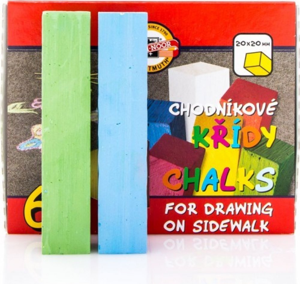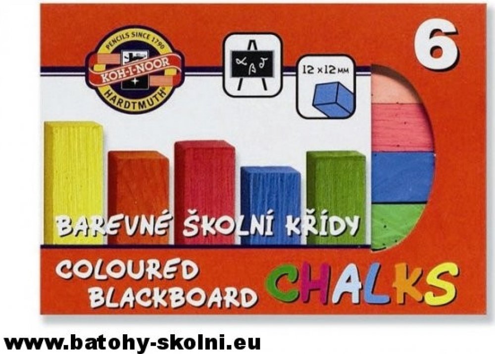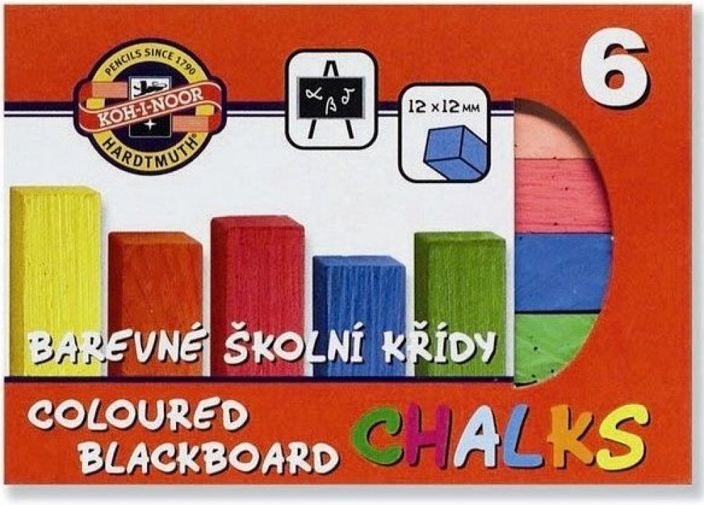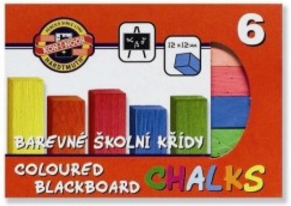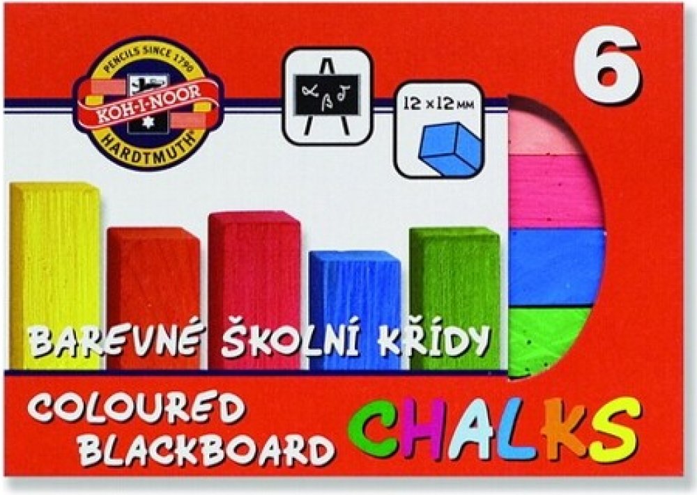 Souprava 6 kusů školních barevných čtyřhranných kříd o rozměrech 12 x 12 x 100 mm, které jsou určeny pro psaní na školní tabule, vložených do krabičky s potištěnou manžetou.