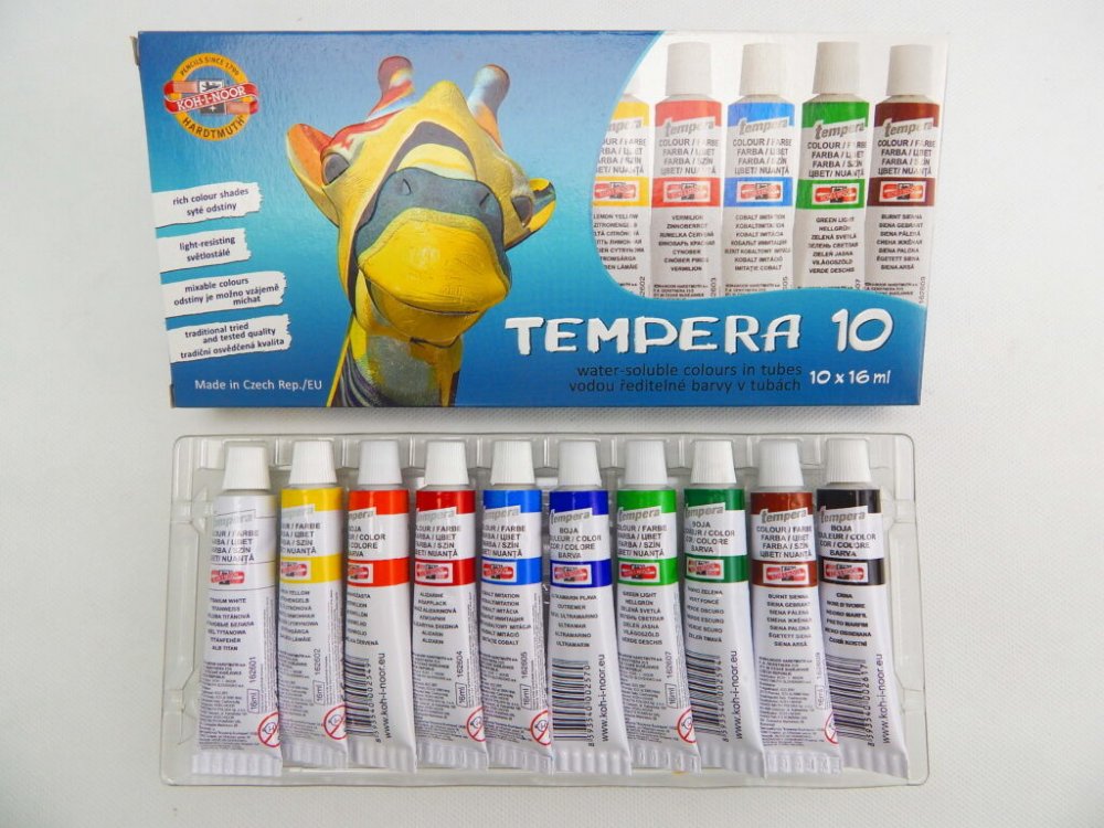 souprava temperových barev 10 Barvy určené především pro výuku výtvarné výchovy ve školách, ale používají je i profesionální výtvarníci. Jsou vysoce kvalitní, husté, vzájemně se mísitelné, vodou ředitelné, jsou bezpečné a spolehlivě vypratelné. Barvy velmi rychle zasychají a po zaschnutí je lze znovu rozmít vodou. Základem jsou jemně utřené pigmenty rozmíchané do emulze vhodného oleje. Vyráběny v ...