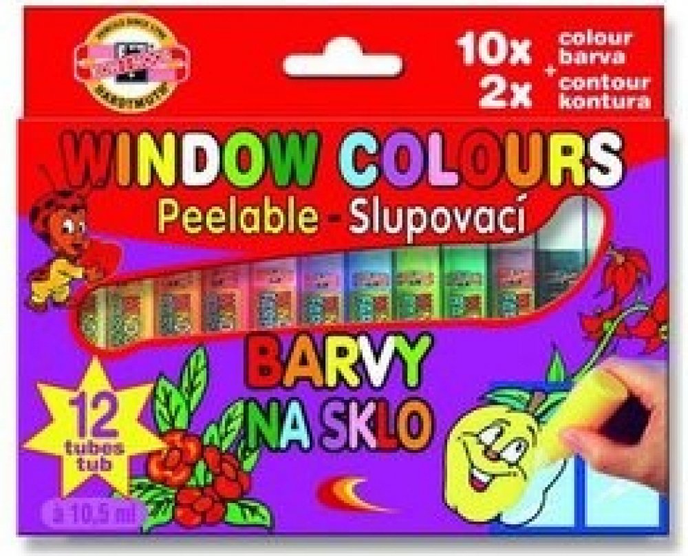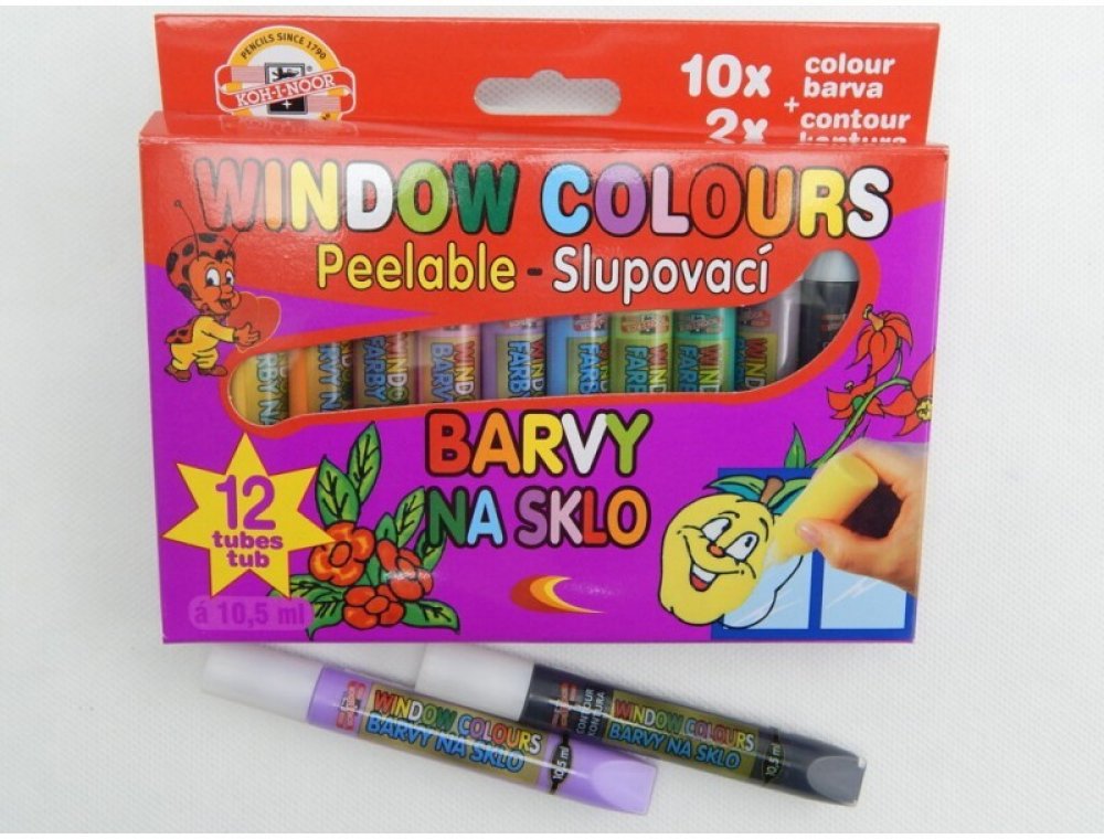 Sada 12 ks 10,5 ml tub v potištěné kartónové skládačce barev na sklo (barvy: bílá, žlutá, světlé modrá, oranžová, červená, tmavě modrá, fialová, světle zelená, tmavě zelená, světlé hnědá, kontura černá, kontura zlatá), přiloženy 2 šablony s motivy na malování, 1 fólie, návod na použití. Barvy na sklo se používají k malování na sklo, zrcadlo, sklenice a dlaždice. Nejprve se barva nanese přímo z tuby na fólii. Po zaschnutí se obrázek z fólie opatrně odloupne a nalepí na požadovaný povrch. Určeno pro děti starší 3 let.