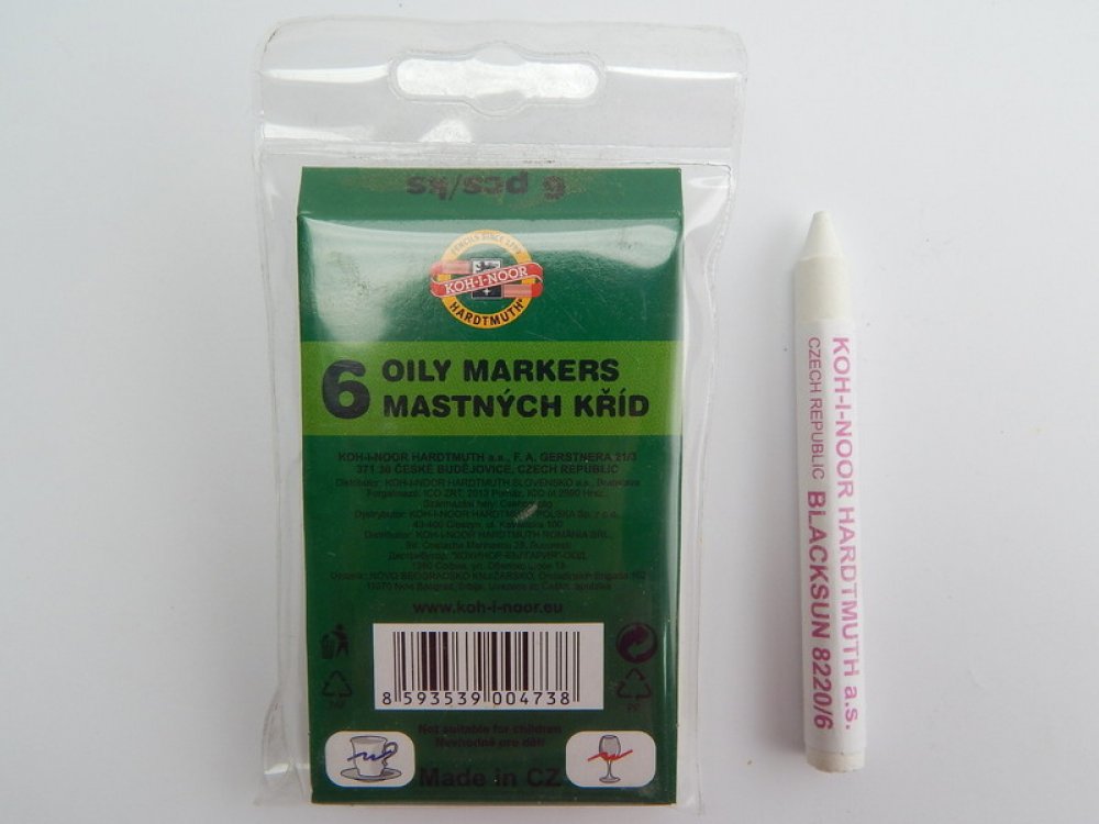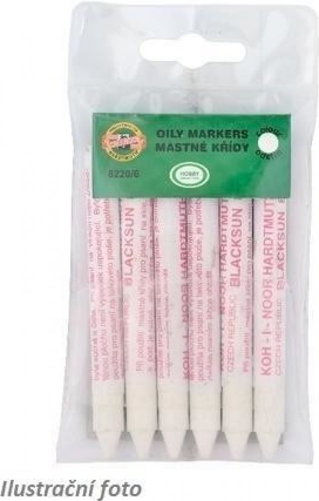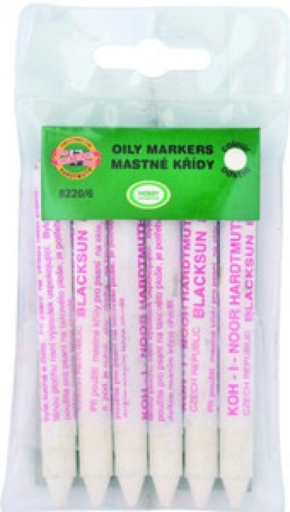Koh-I-Noor křída univerzální olejová pastelka - 6 / Bílá - balení po 6 křídách: --- kulatá olejová křída, D = 9 mm-L = 90 mm v balení po 6 křídách pro značení na hladké povrchy, např. sklo, plast, gumu, porcelán atd./ povrch musí být čistý a suchý tyto křídy jsou - nevhodné pro děti! - Kulaté mastné průmyslové křídy, O - 9 mm , délka - 90 mm. Zabalené do PP pouzdra po 6 ks jedné barvy. Křídy jsou určeny pro označování a hodí se i na hladké povrchy, např. sklo, plast, porcelán. Je nutné aby plocha, na kterou se píše, bylasuchá a čistá. Křídy nejsou vhodné pro děti.