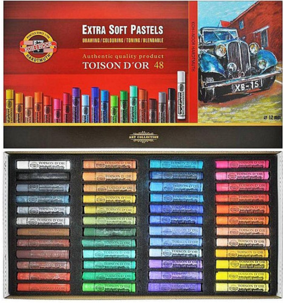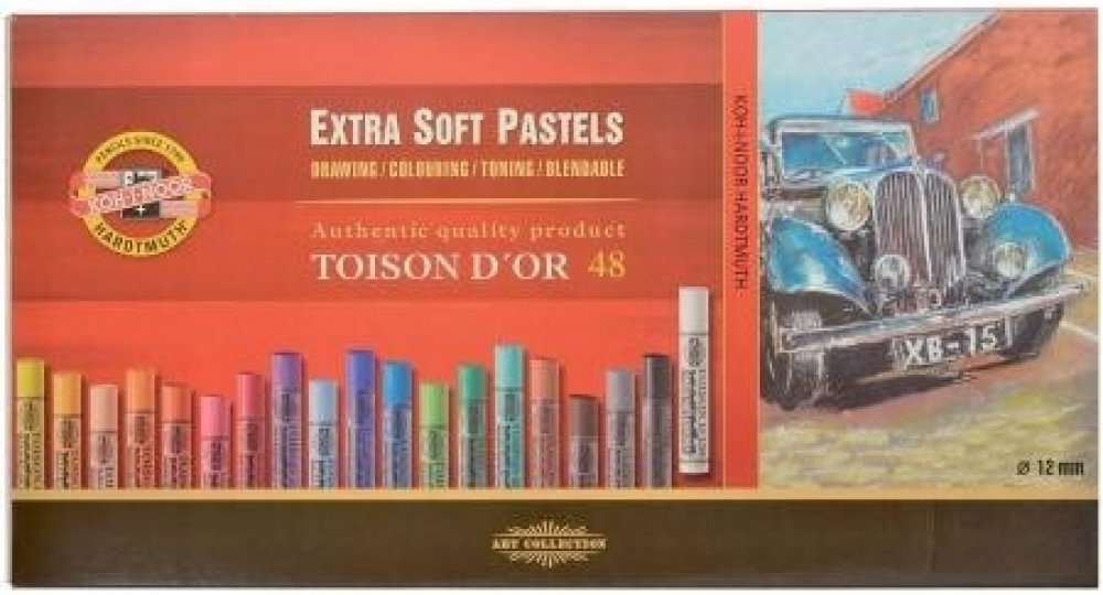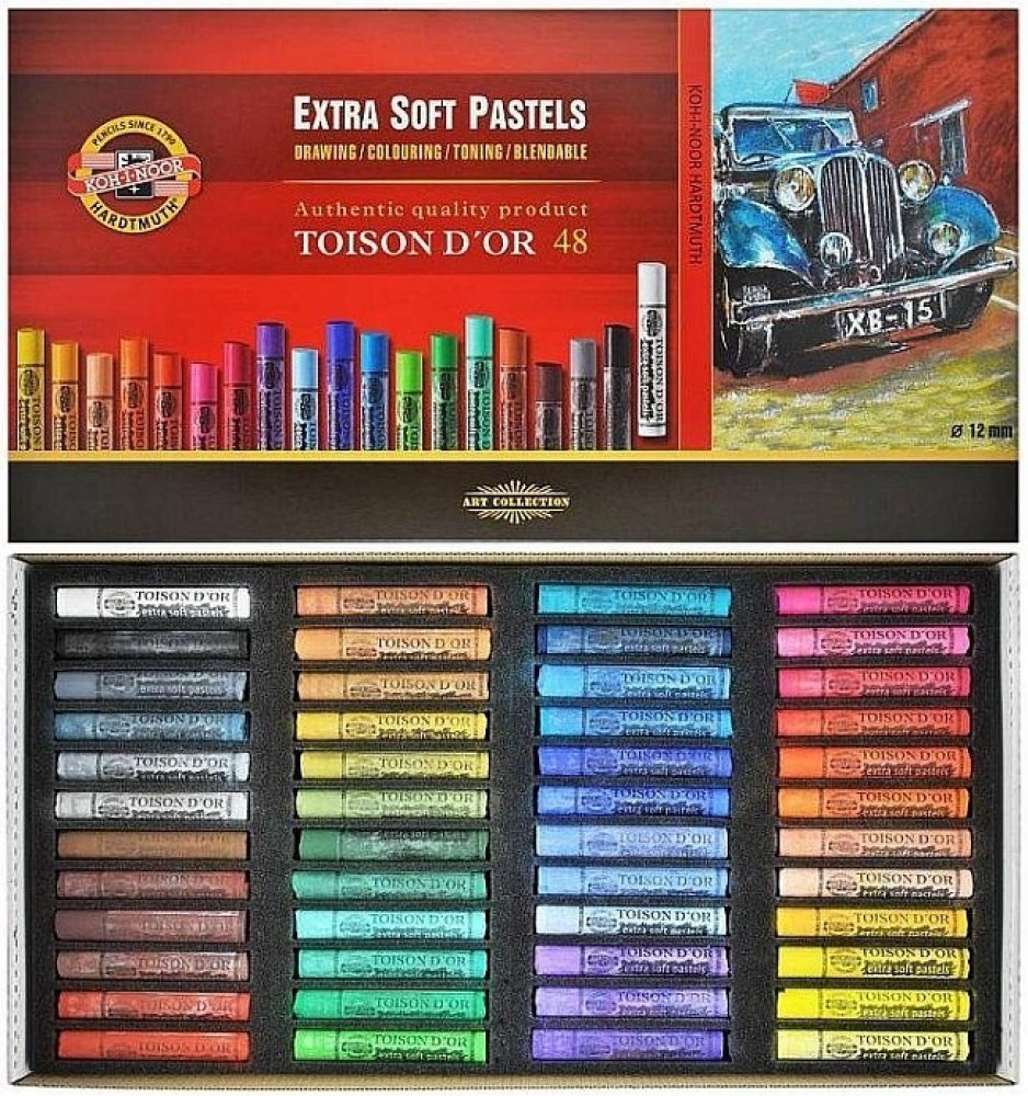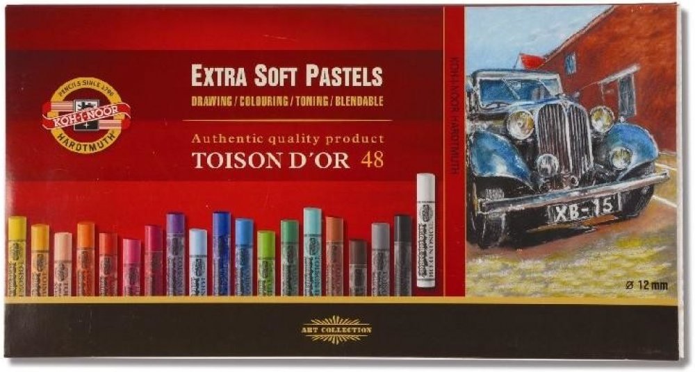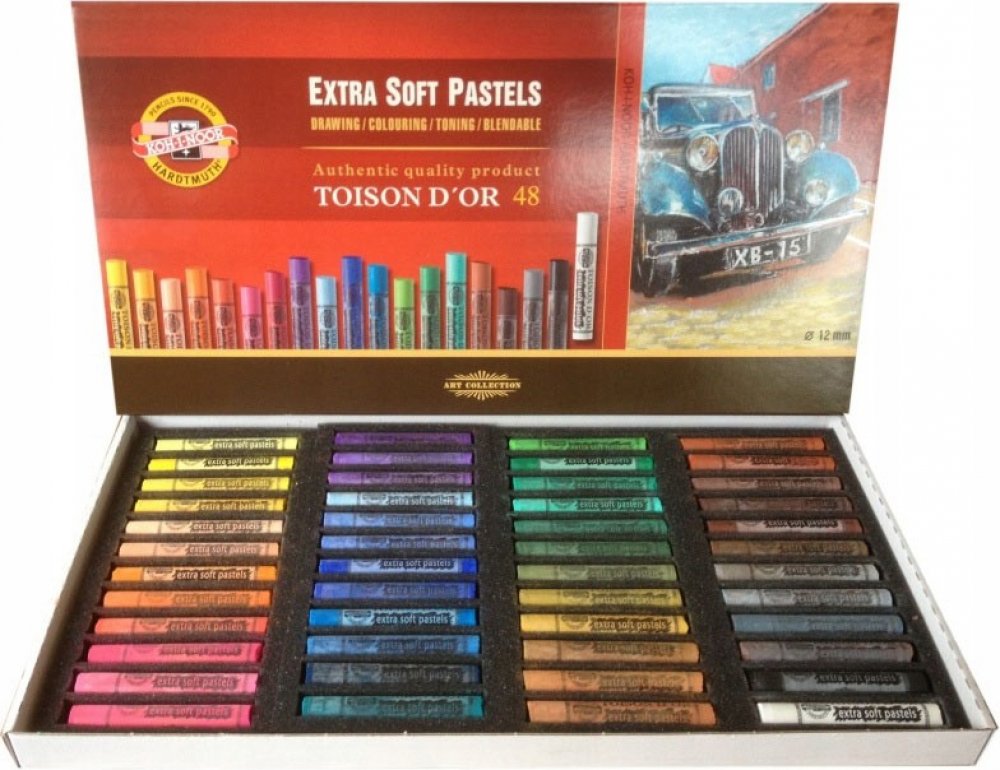 ART. KOH-I-NOOR TOISON D`OR 8556. Souprava 48 ks Extra prašných uměleckých pastelů s ovinem, o průměru 12 mm a délky 75 mm. Pastely jsou určeny pro umělecké a hobby kreslení. Vyznačují se vysokou pigmentací a proto mají jasné barvy a vysokou světlostálost. Kresbu doporučujeme ukončit fixativem jako ochranu proti vyprašování a nebo rozmazání.