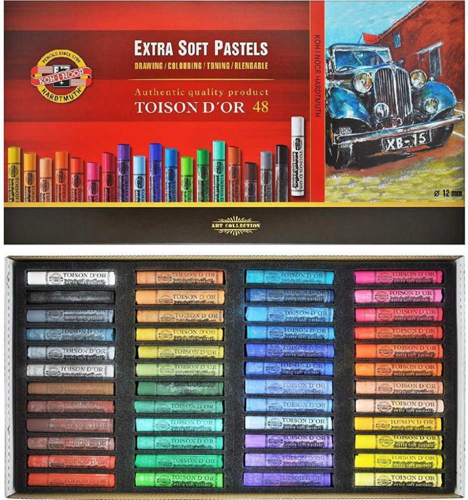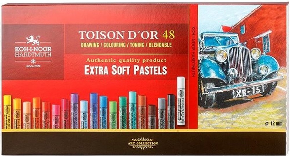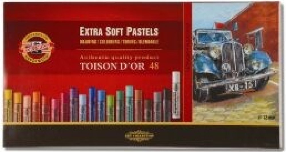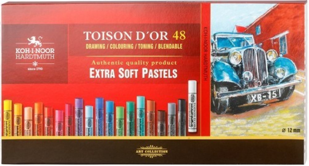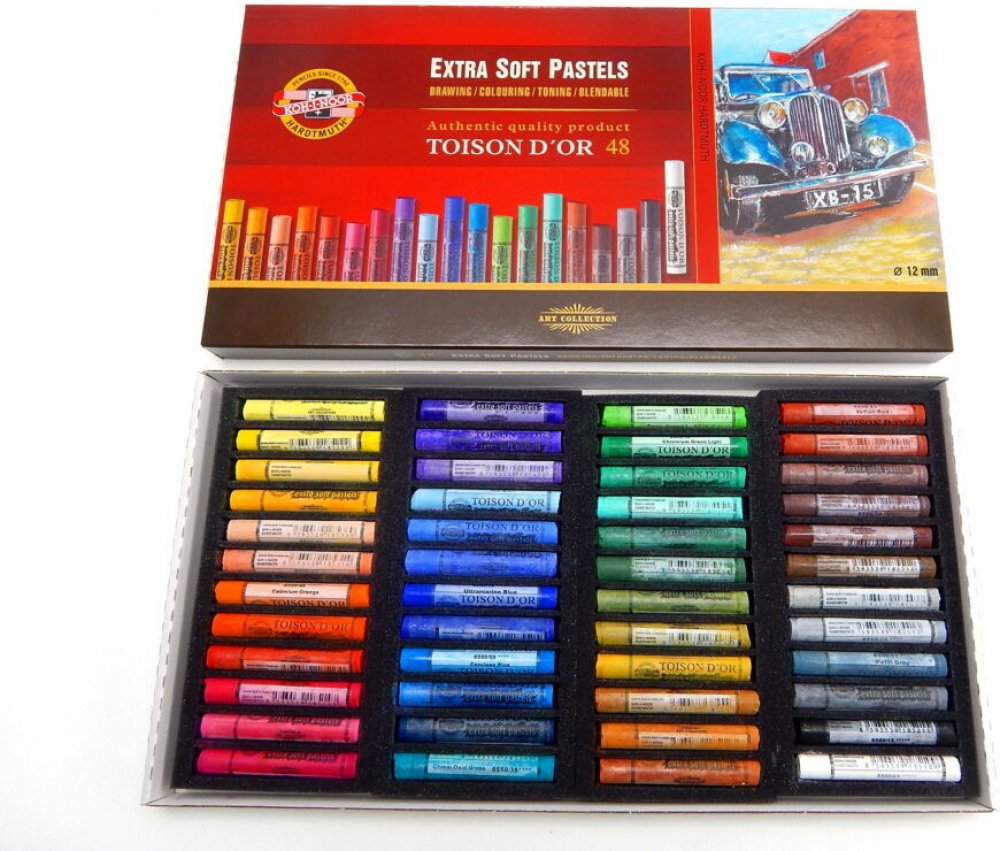ART. KOH-I-NOOR TOISON D`OR 8556. Souprava 48 ks Extra prašných uměleckých pastelů s ovinem, o průměru 12 mm a délky 75 mm. Pastely jsou určeny pro umělecké a hobby kreslení. Vyznačují se vysokou pigmentací a proto mají jasné barvy a vysokou světlostálost. Kresbu doporučujeme ukončit fixativem jako ochranu proti vyprašování a nebo rozmazání.