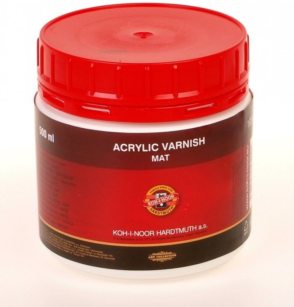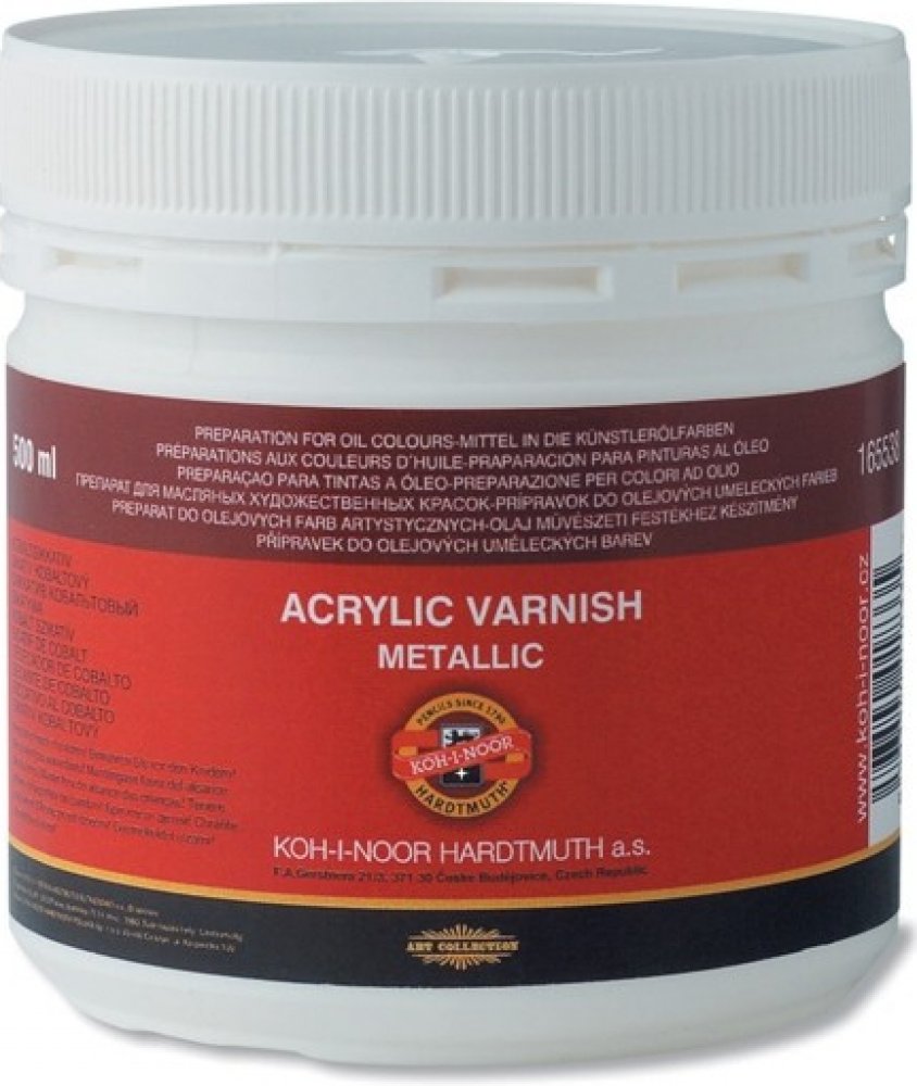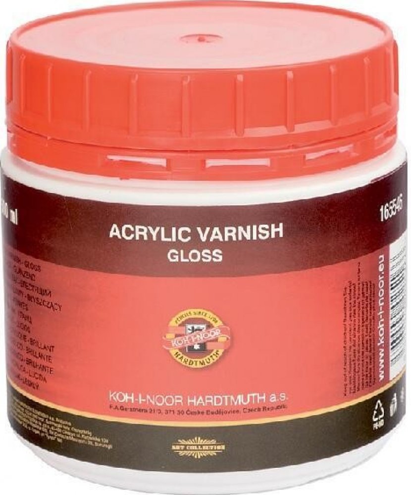 Koh-I-Noor akrylový lak lesklý, 500 ml Vysoce kvalitní ochranný bezbarvý akrylový lak na bázi vodních disperzí. Používá se na hotovou malbu. Vytvoří na ní lesklý tvrdý film, který ji chrání proti poškození a usnadňuje její čištění. Po zaschnutí je vodostálý, na povrchu nelepí, nemění barevné tóny výsledného obrazu a nežloutne vlivem světla. Lak nanášejte štětcem ve vodorovné poloze na dokončený ob...