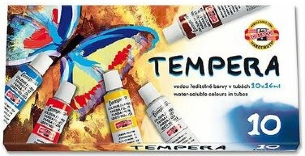 Vodou ředitelné temperové barvy v tubě. Obsah tuby 16 ml, výška tuba cca 10 cm. Barvy jsou určené především pro výuku výtvarné výchovy ve školách. Jsou vysoce kvalitní, husté, vzájemně se mísitelné, vodou ředitelné, jsou bezpečné a spolehlivě vypratelné. Barvy velmi rychle zasychají a po zaschnutí je lze znovu rozmýt vodou. Základem jsou jemně utřené pigmenty rozmíchané do emulze vhodného oleje.