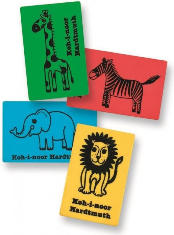Plastická pryž netvárlivá, vhodná pro stírání grafitových čar. Hranatá, kvádrová, různé barevné modifikace, motiv obrázků - Afrika. Zelená pryž - obrázek žirafy, červená pryž - obrázek zebry, modrá pryž - obrázek slona, žlutá pryž - obrázek lva. Rozměr 35,5 x 23 x 8 mm.