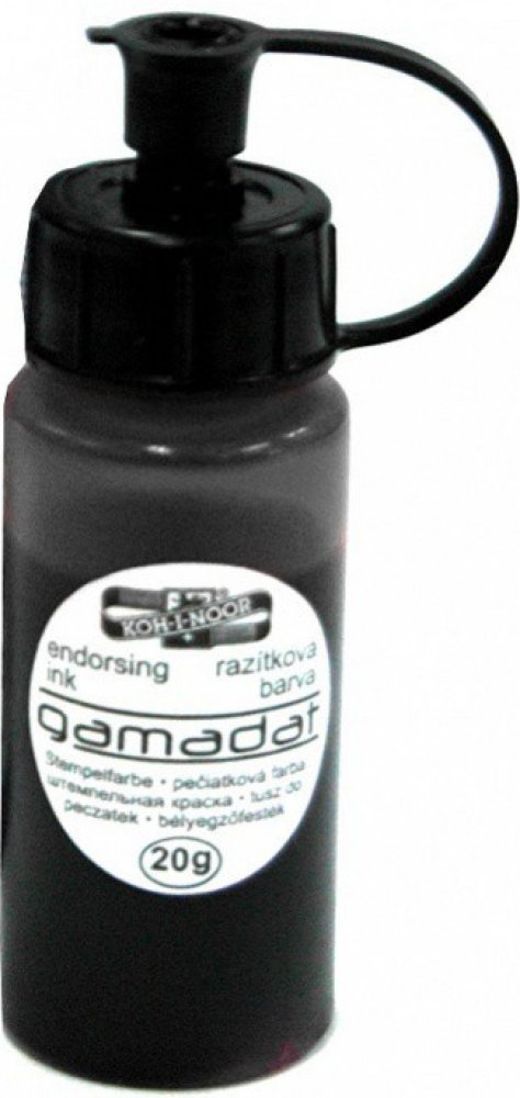 Barva razítková Gamadat 20g černá. Razítková barva , která neobsahuje vodu je vhodná pro razítka, která jsou zhotovena z fotopolymerní folie , otisk se snímá z plněné podušky přímo v razítku nebo z plstěné podušky na papír. 20 g v PE lahvičce s aplikátorem.