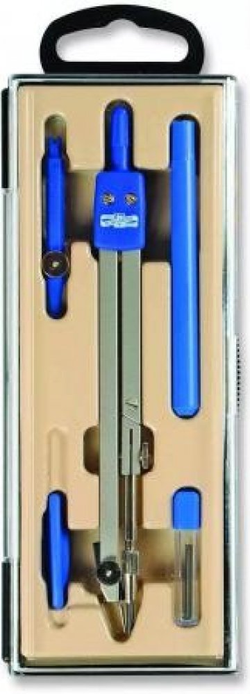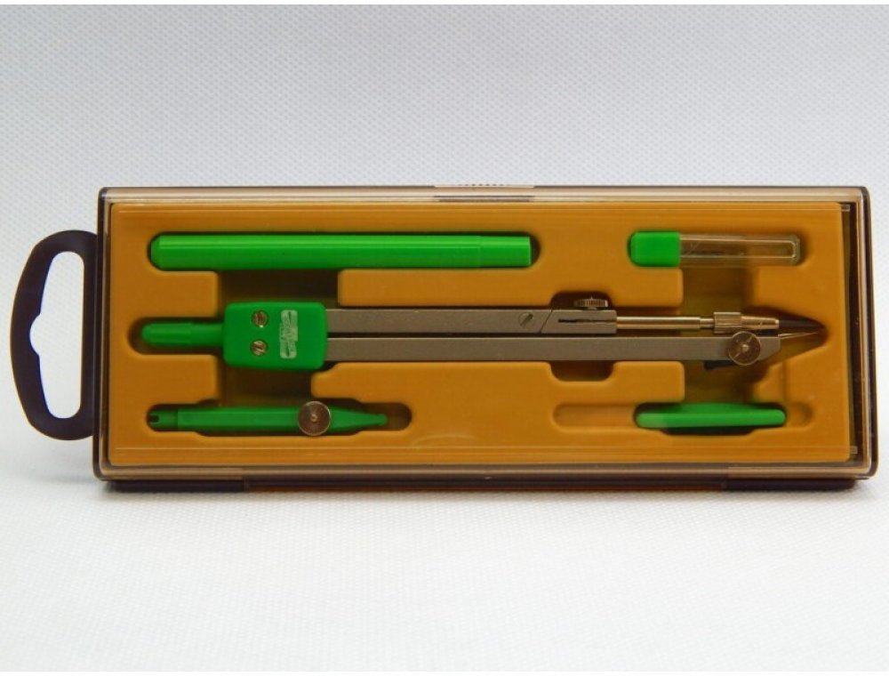 Souprava kružidel, 5 dílná, v obalu z tvrdého plastu s průhledným víkem a eurozávěsem obsahuje kružidlo kovové, násadku, pero kružidla, tuženku a šroubovák s držákem, je určena pro rýsování na základních školách. Slouží k rýsování kružnic pr. 5-400 mm tuhou nebo tuží a čar tuží o šířce 0,35-0,8 mm, upínací průměr pro výměnné jednotky 3,5 mm. Ramena kružidla a koleno jsou výlisky ze Zn v metalíze imitace Ni, kovové díly niklované , plastové díly - assort barev - jsou vždy v barvě závěšky kružidla - červená, černá, zelená, modrá a lila. Koleno kružidla umožní lepší nastavení kružidla a tím zvýší komfort rýsování.