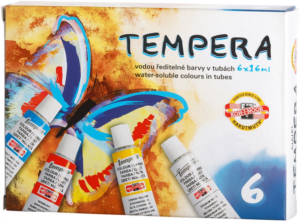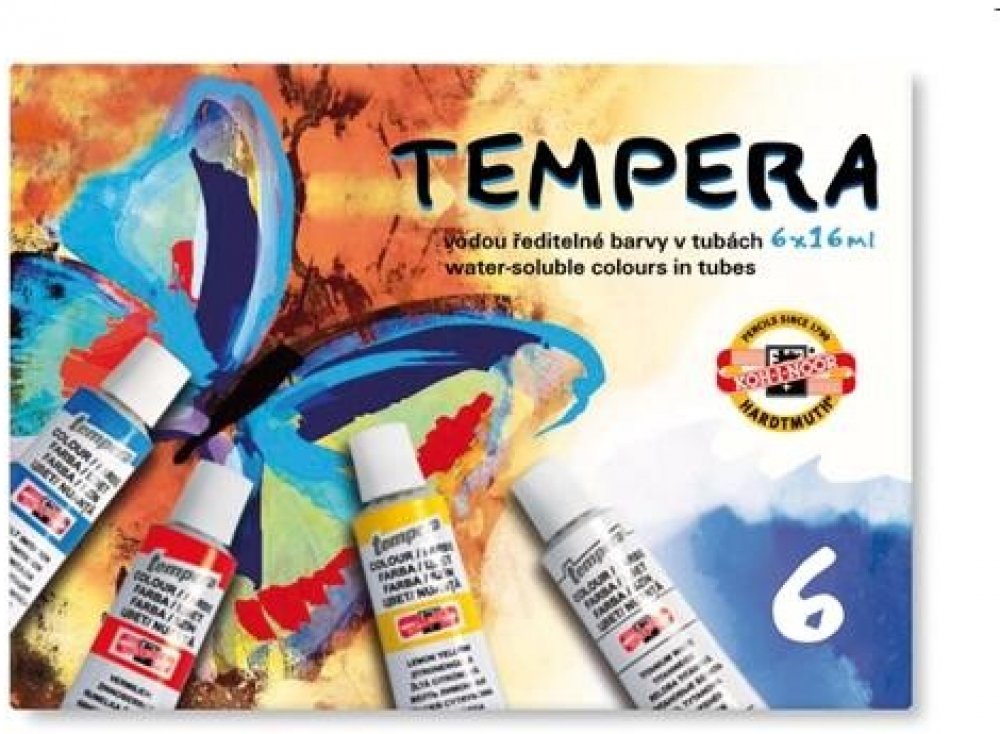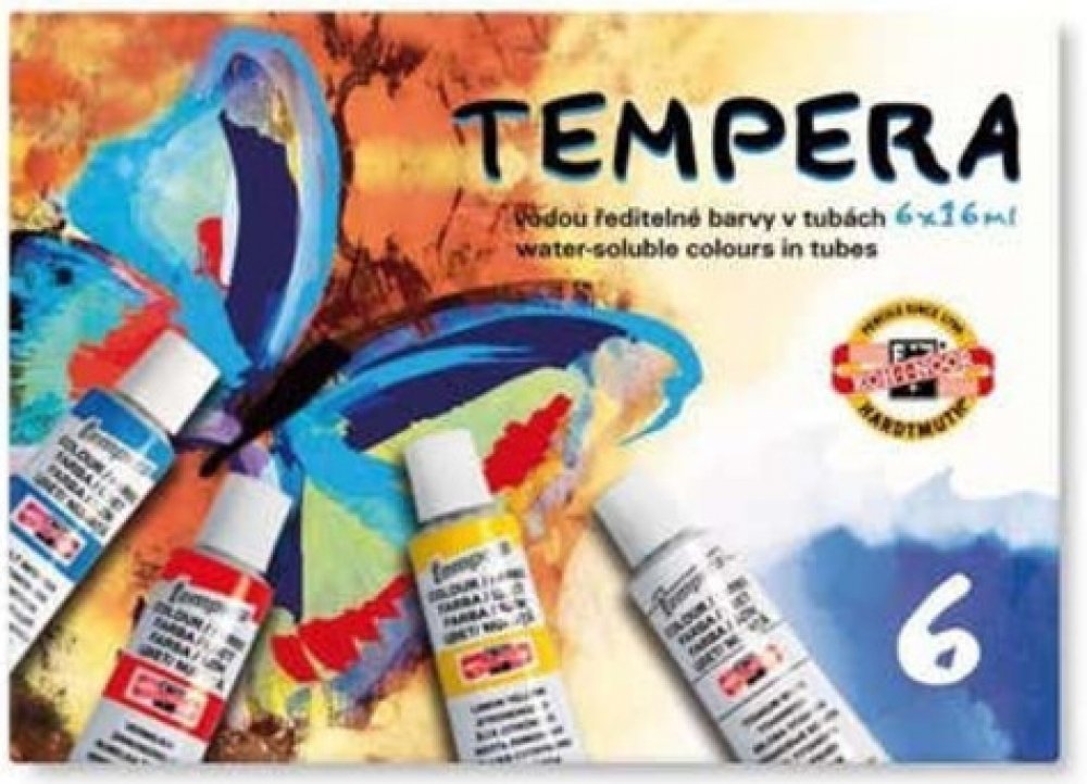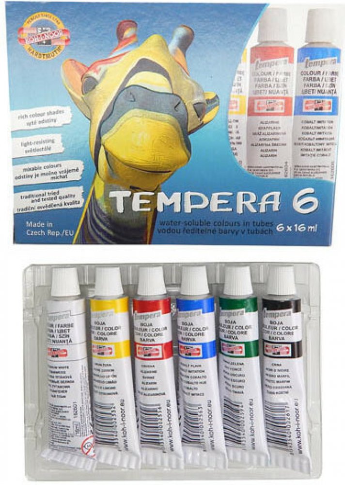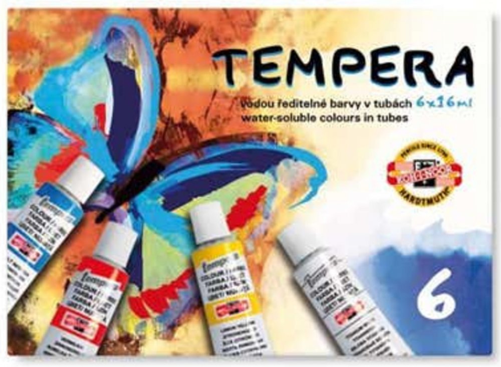 Temperové barvy jsou vysoce kvalitní, husté, vzájemně dobře mísitelné a vodou ředitelné. Barvy jsou rychleschnoucí a po zaschnutí je lze znovu rozmýt vodou. Jsou určené především pro výuku výtvarné výchovy ve školách, ale používají je i profesionální výtvarníci. Základem jsou jemně utřené pigmenty rozmíchané do emulze vhodného oleje a pojiva. Obsah tuby: 16 ml. Balení obsahuje 6 barev. Cena za bal...