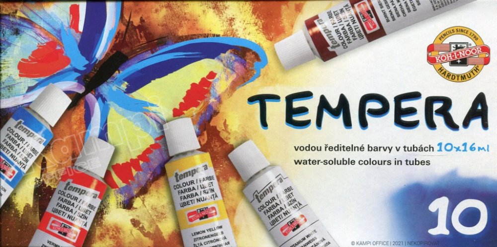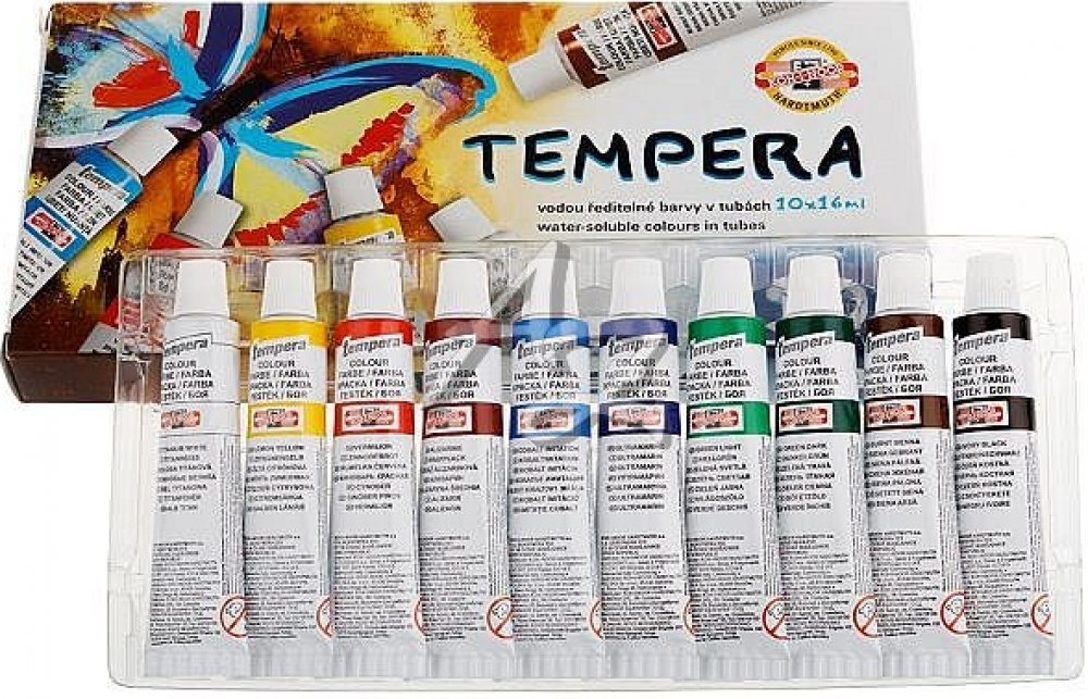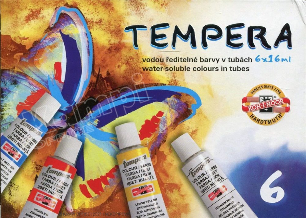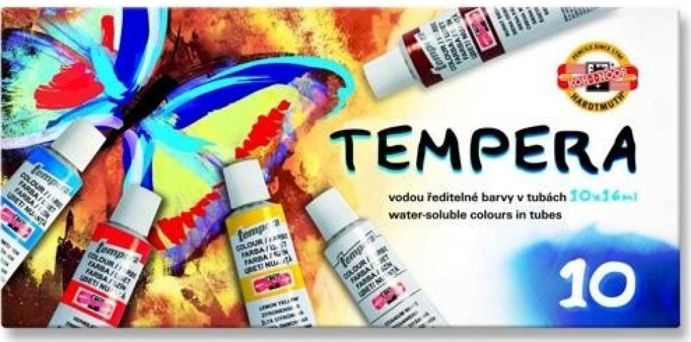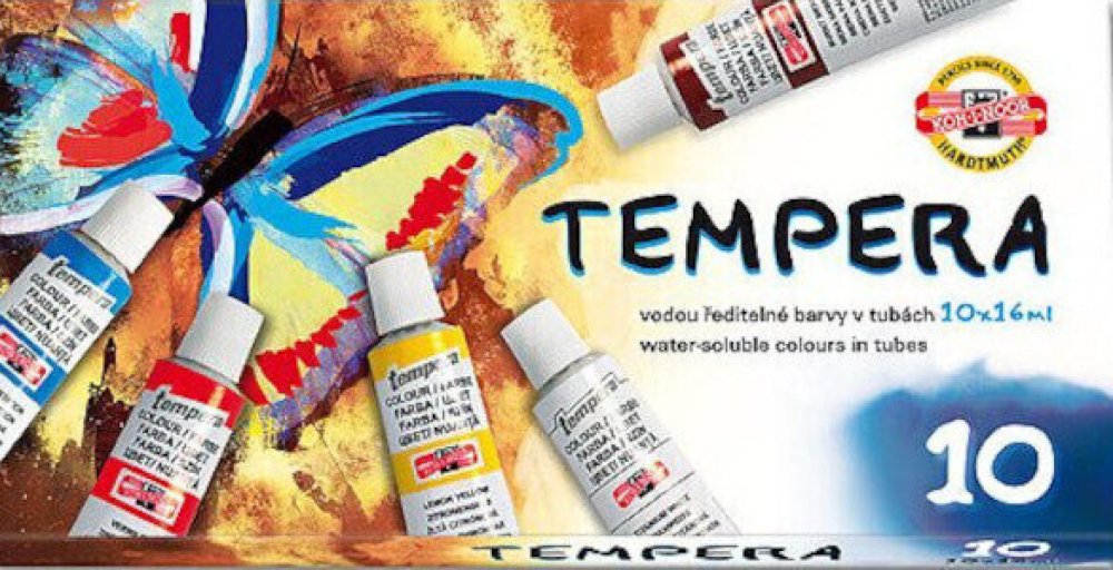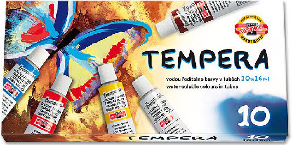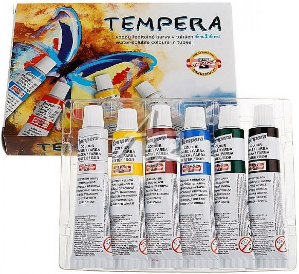 Temperové barvy jsou vysoce kvalitní, husté, vzájemně dobře mísitelné a vodou ředitelné. Barvy jsou rychleschnoucí a po zaschnutí je lze znovu rozmýt vodou. Jsou určené především pro výuku výtvarné výchovy ve školách, ale používají je i profesionální výtvarníci. Základem jsou jemně utřené pigmenty rozmíchané do emulze vhodného oleje a pojiva. Obsah tuby: 16 ml. Balení obsahuje 6 barev. Cena za bal...
