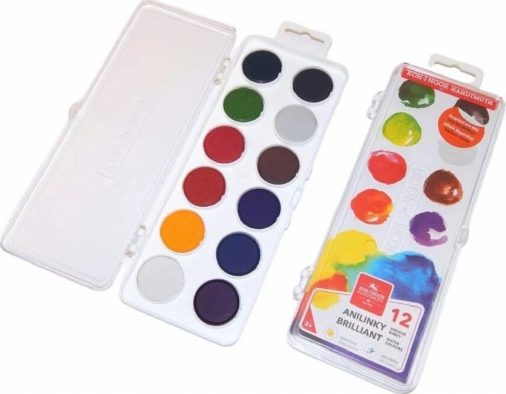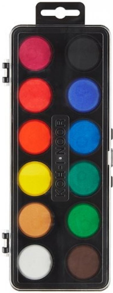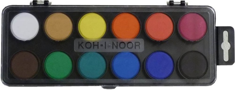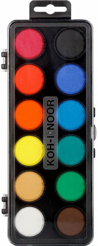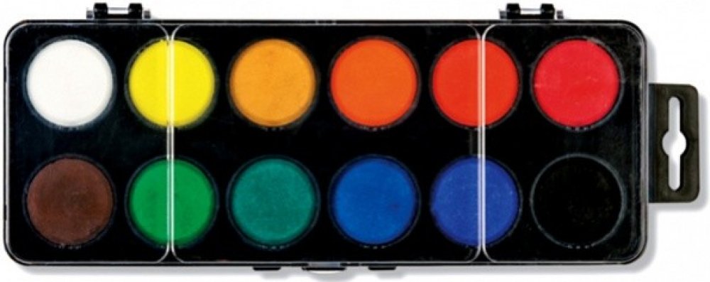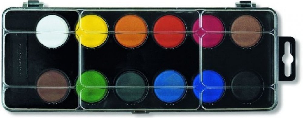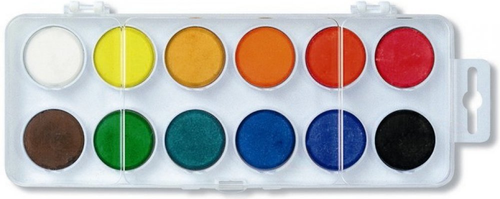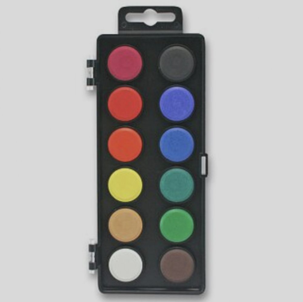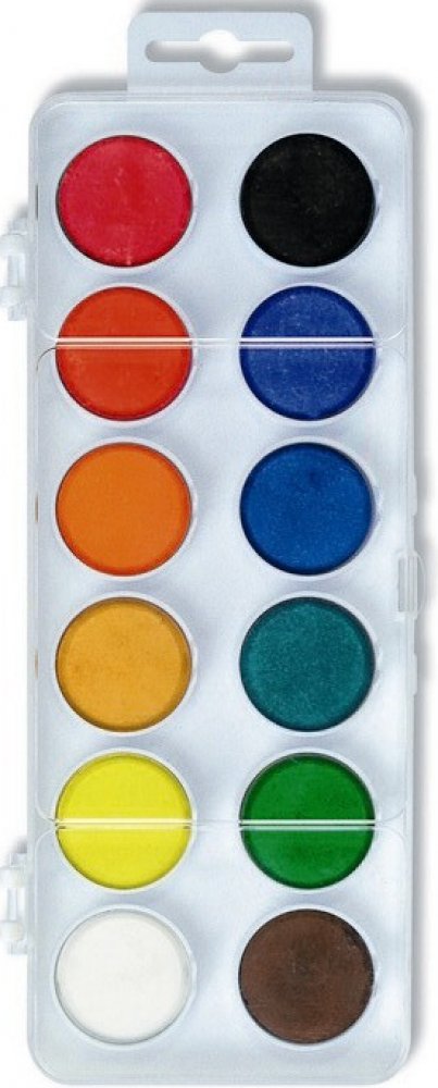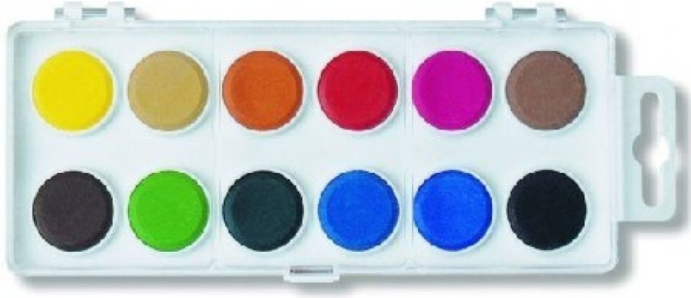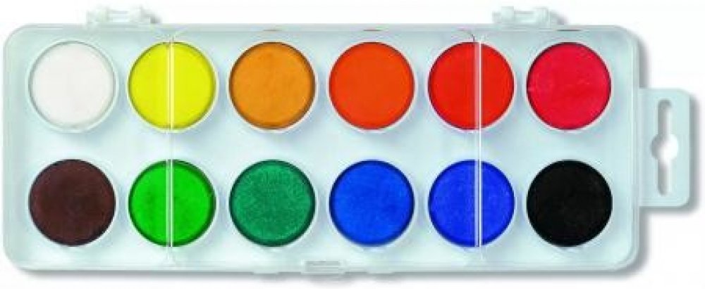 Školní vodové barvy 12 odstínů s tabletami o průměru 30 mm v obdélníkové, plastové, jednopatrové krabičce s transparentním víčkem.