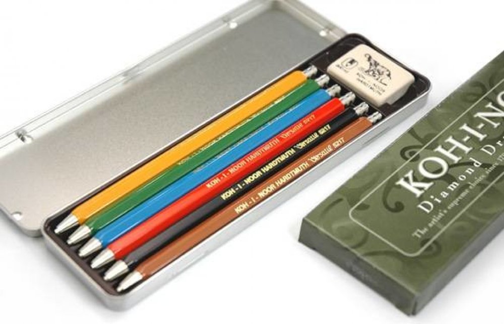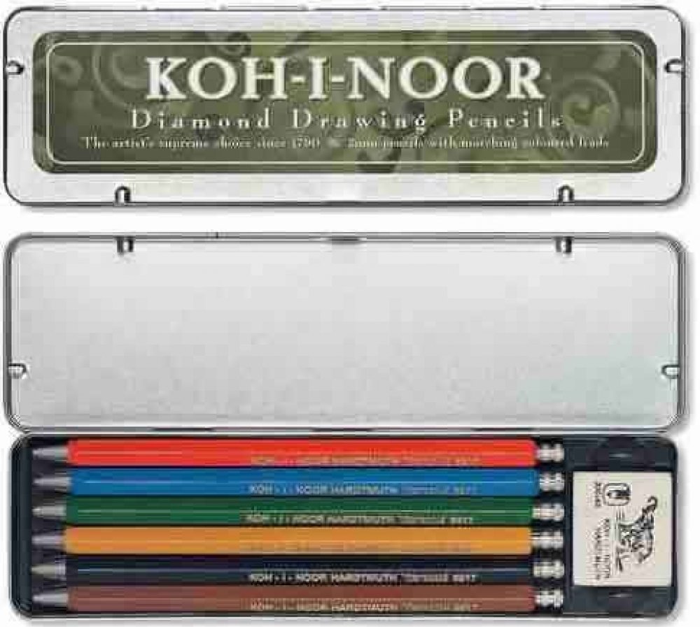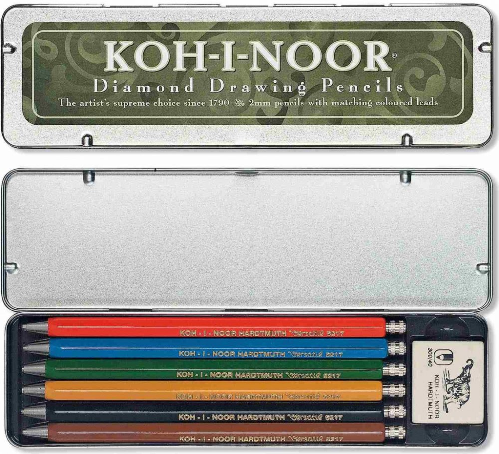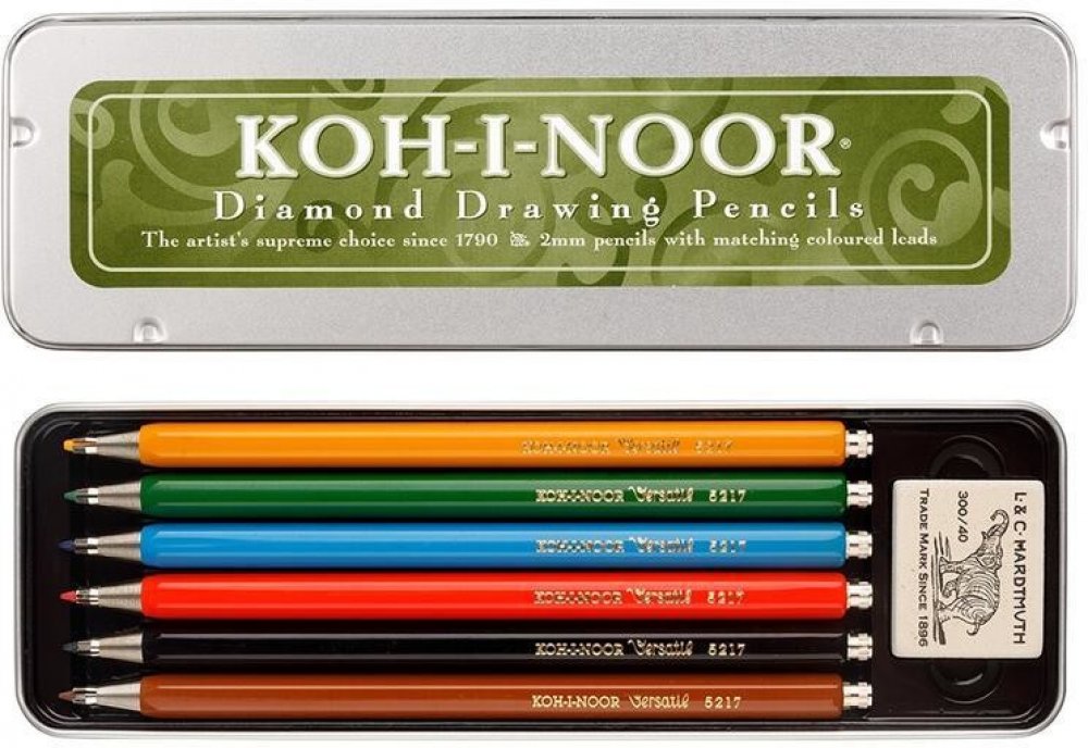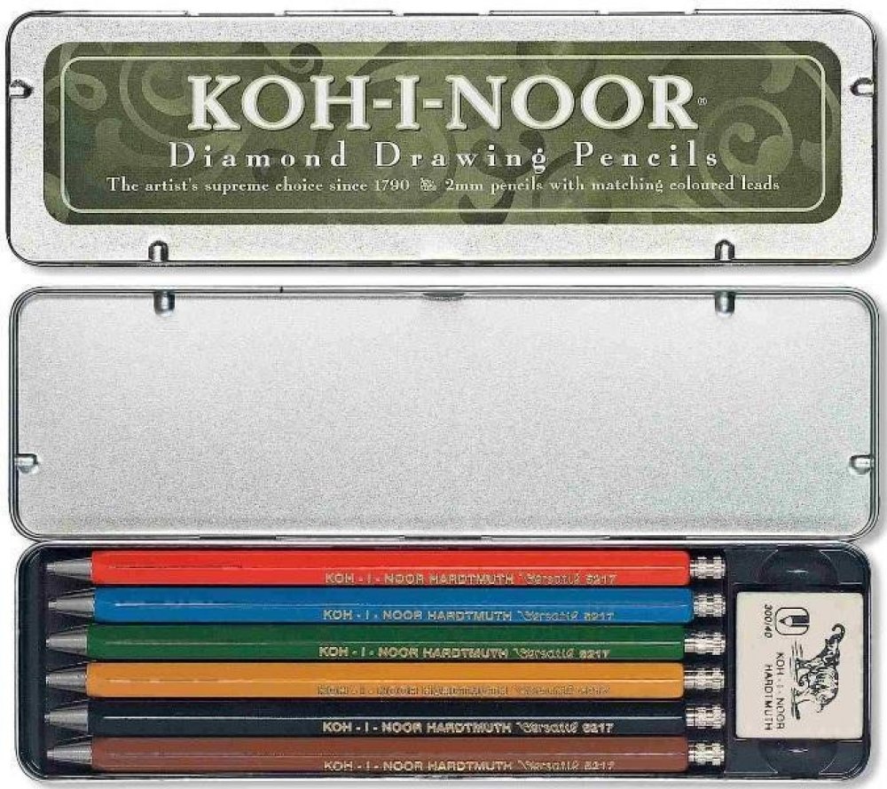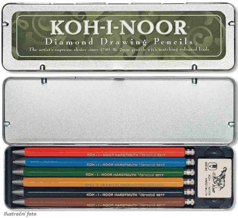 souprava tužek mechanických 5217 6 Souprava tužek mechanických padacích bez klipu v šesti barvách s odpovídajícími barevnými pastelovýmí tuhami pr. 2 mm - pastelky, barvy žlutá, zelená, modrá, červená, černá a hnědá + stěrací pryž určená pro kancelářské použití - řada office. Tuha se posunuje stisknutím knoflíku hrotítka v nakloněné poloze tužky, tím dojde k otevření kleštiny a vysunutí tuhy.Tuhy lze hrotit, hrotítko ve stiskacím knoflíku tužky. Plášť tužky kovový šestihranný 0K7 lakovaný barvou, mechanika je kovová. Baleno do plechové krabičky s okrasným štítkem na víku, tužky a pryž uloženy do tvarové vložky. Plechová krabička je zasunuta do papírové krabičky ve stejněm designu jako okrasný štítek na víku plechové krabičky.
