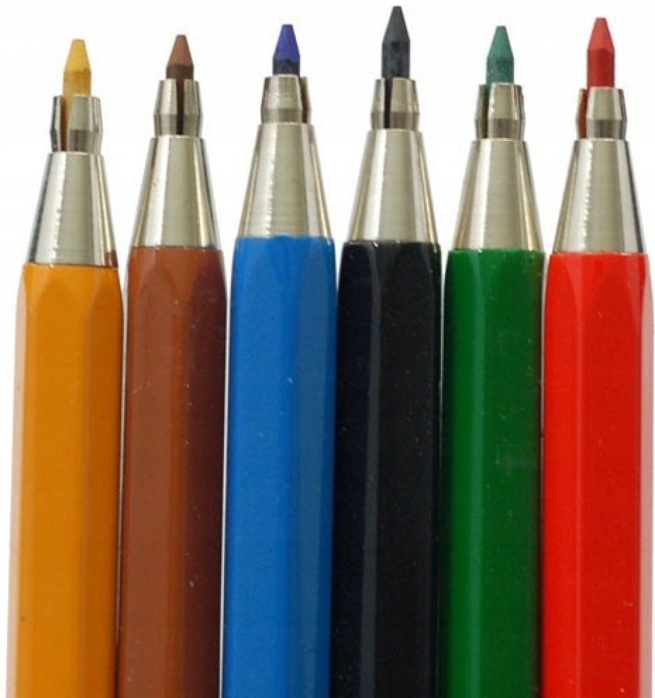 souprava tužek mechanických 5217 6 Souprava tužek mechanických padacích bez klipu v šesti barvách s odpovídajícími barevnými pastelovýmí tuhami pr. 2 mm - pastelky, barvy žlutá, zelená, modrá, červená, černá a hnědá + stěrací pryž určená pro kancelářské použití - řada office. Tuha se posunuje stisknutím knoflíku hrotítka v nakloněné poloze tužky, tím dojde k otevření kleštiny a vysunutí tuhy.Tuhy ...