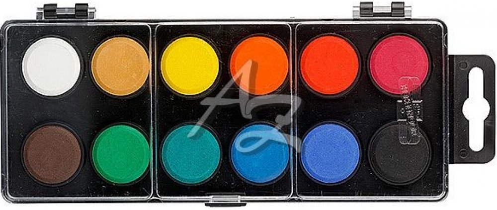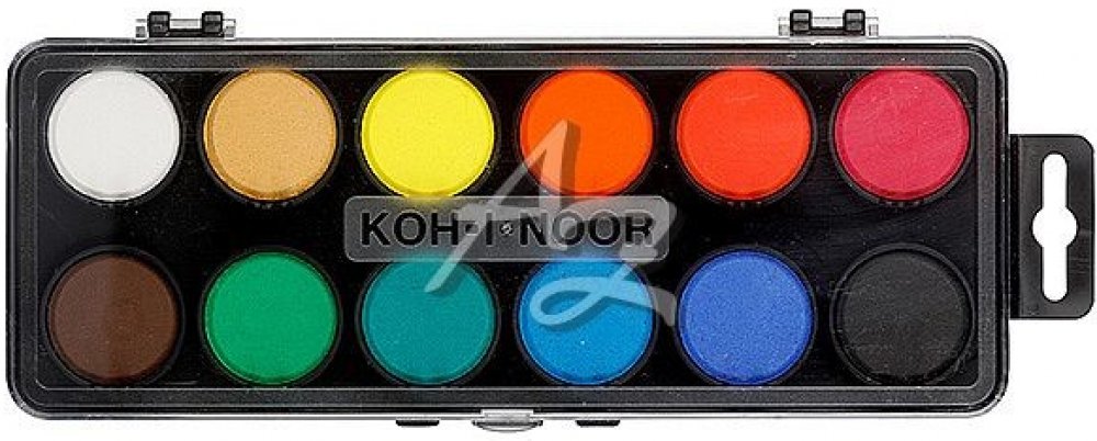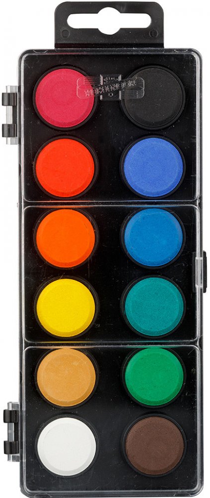 Školní vodové barvy 12ti odstínů s tabletami o průměru 30 mm v obdélníkových, plastových, jednopatrových barevnících s transparentním víčkem. Barvy jsou výrazné, vyznačují se svým vysokým obsahem pigmentů. Jsou certifikované a zcela bezpečné pro děti.