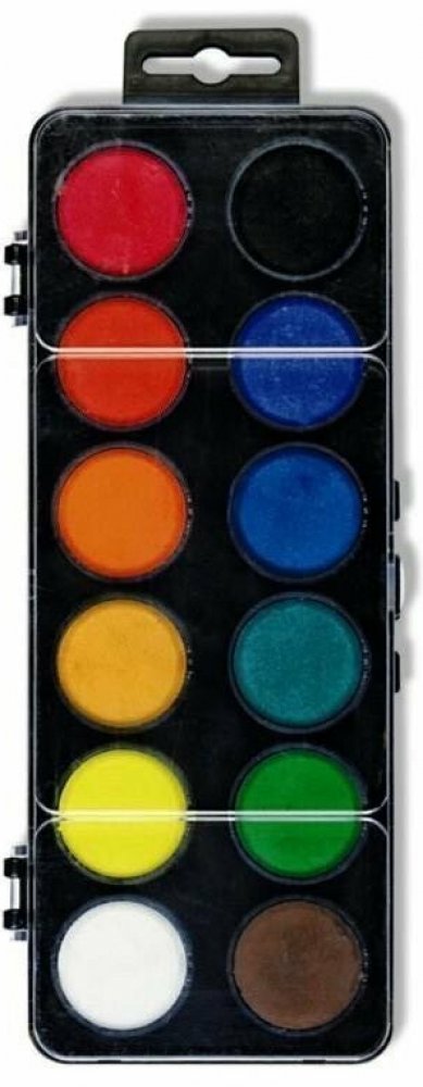 Školní vodové barvy 12ti odstínů s tabletami o průměru 30 mm v obdélníkových, plastových, jednopatrových barevnících s transparentním víčkem. Barvy jsou výrazné, vyznačují se svým vysokým obsahem pigmentů. Jsou certifikované a zcela bezpečné pro děti.