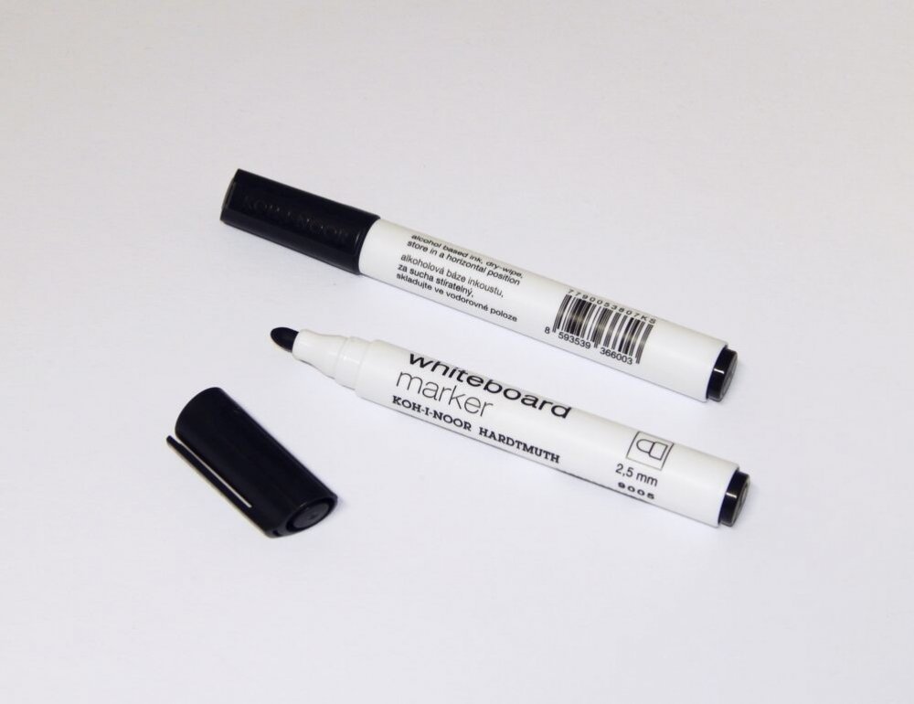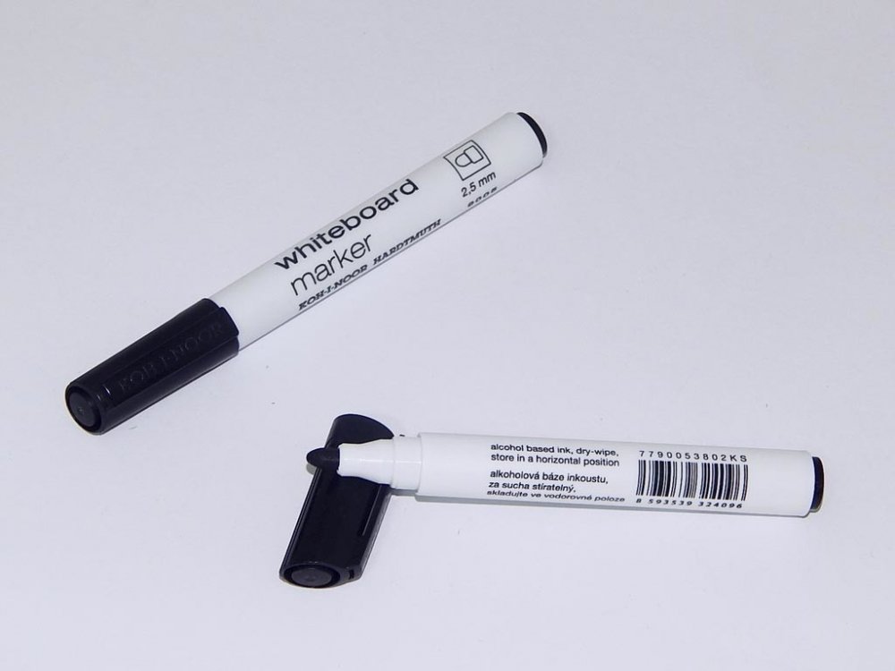 Značkovače na bílé tabule, plněné pigmentovými za sucha stíratelnými inkousty na alkoholové bázi, odstín červený, modrý, zelený, černý. Stopa písma je za sucha stíratelná. Jsou určeny pro psaní na neporézní bíle tabule ve školách a kancelářích. Při použití na papír je stopa písma světlostálá. Klínovými hroty průměru 5 mm je možné psát šířkou stopy písma 1 - 5 mm, délka 400 m. Baleny jsou v papírov...