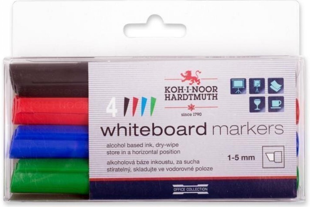 Značkovače na bílé tabule, plněné pigmentovými za sucha stíratelnými inkousty na alkoholové bázi, odstín červený, modrý, zelený, černý. Stopa písma je za sucha stíratelná. Jsou určeny pro psaní na neporézní bíle tabule ve školách a kancelářích. Při použití na papír je stopa písma světlostálá. Klínovými hroty průměru 5 mm je možné psát šířkou stopy písma 1 - 5 mm, délka 400 m. Baleny jsou v papírov...