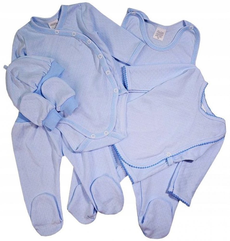 Kojenecká 6 dílná soupravička v modré barvě s jemným vzorkem.