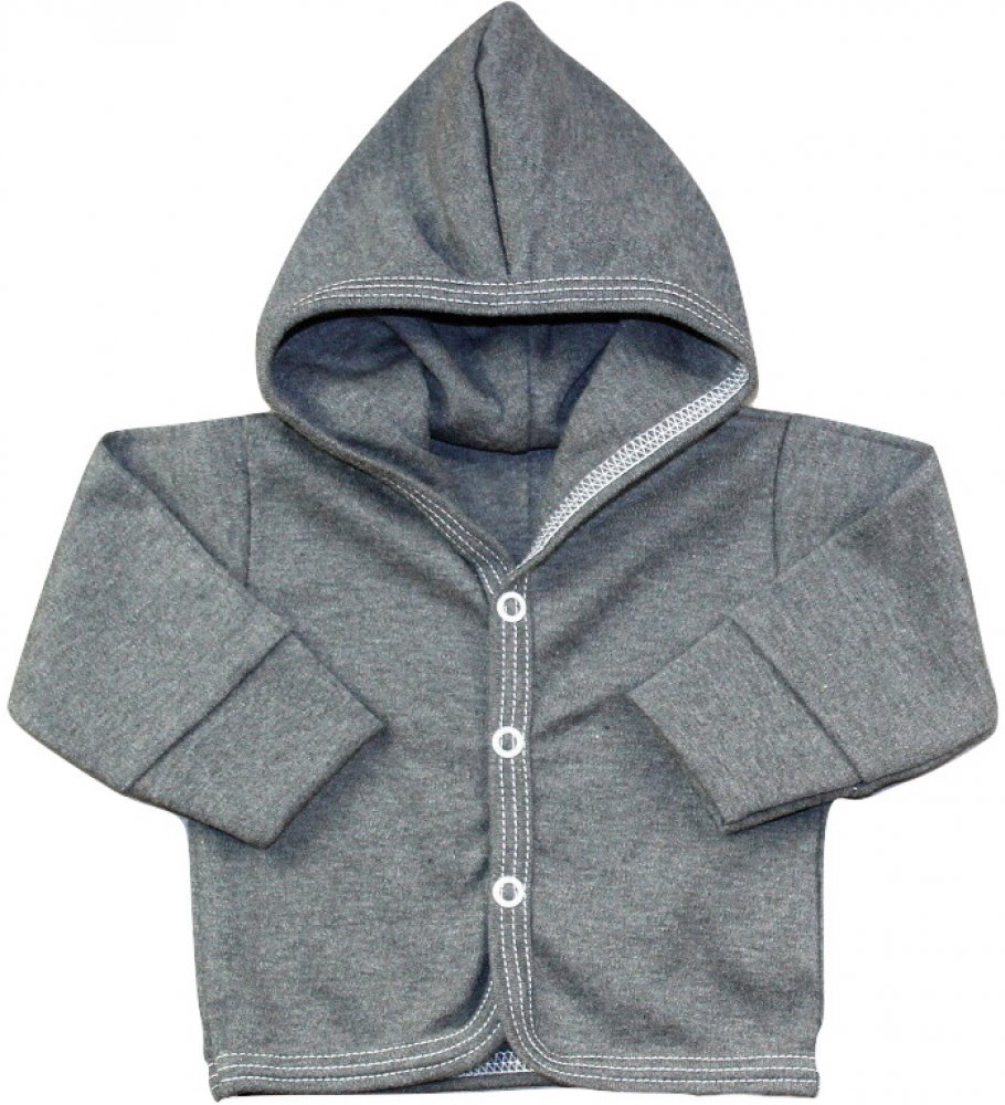 vyrobena z kvalitní bavlny v barvě antracit melanž, zapínání mikinky uprostřed na baby druky, rukávky ukončené pružným nápletem, kapucka z dvojité bavlny. Krásně doplňuje kolekci Tučňák.
