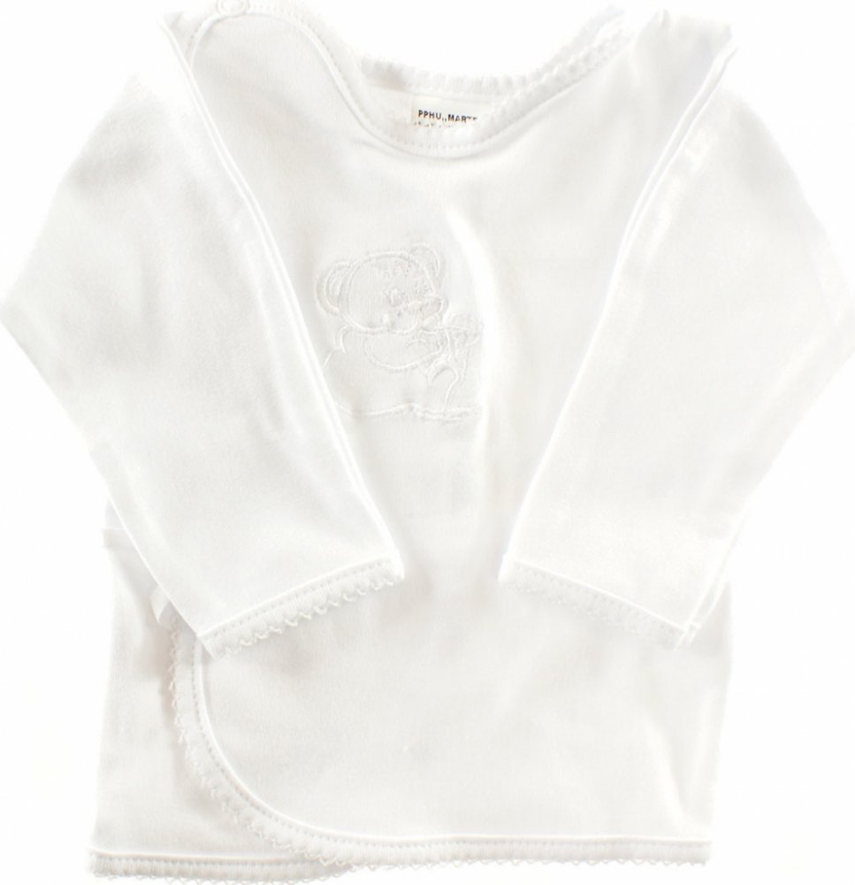 sněhobílá košilka s výšivkou medvídka a ozdobným lemováním, na ramínku zapínání na baby druk, na boku zavazování na stužku. Dvojitá látka na předním díle výborně ochrání citlivé bříško miminka.
