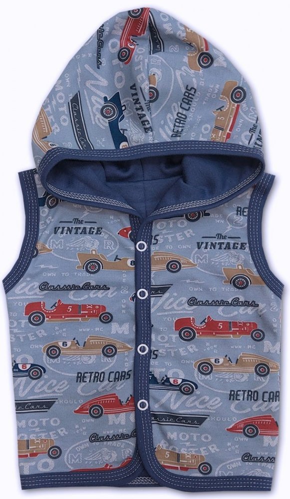 jemný bavlněný materiál s obrázky retro autíček podšitý bavlnou v  barvě denim, zapínání vestičky uprostřed na baby druky.