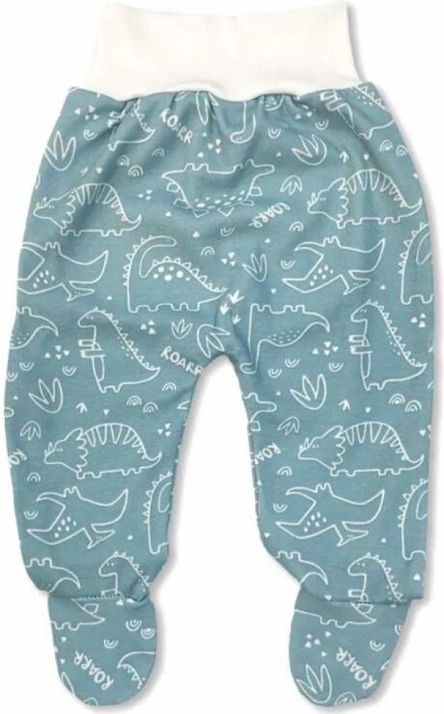 bavlněné polodupačky s obrázky dinosaurů, široký pohodlný pružný pas v bílé barvě , netlačí na bříško dítěte.
