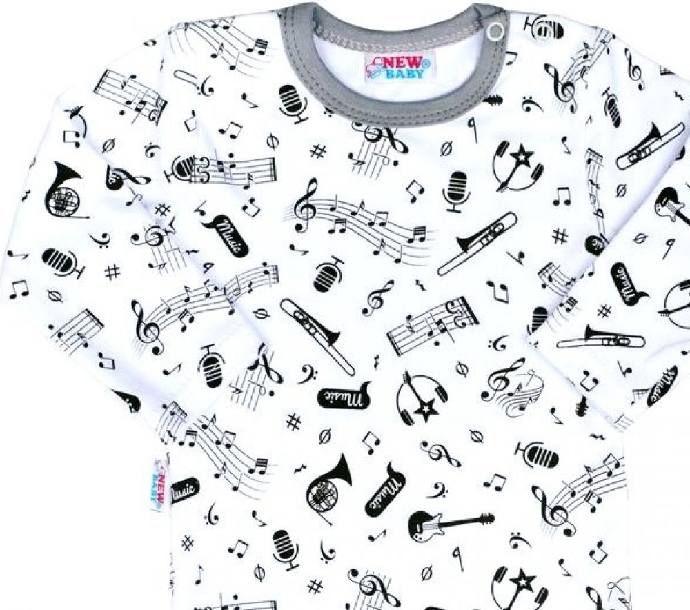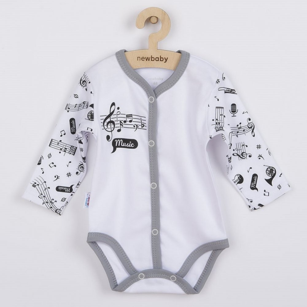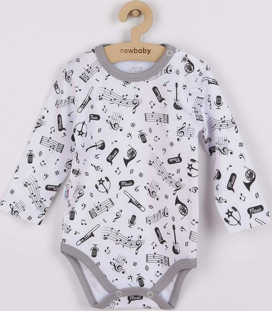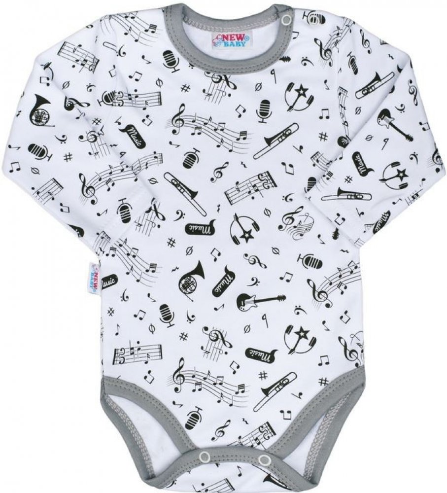 Bavlněné kojenecké body s dlouhým rukávem New Baby Music pro miminka. Body je celopotištěné obrázkem notiček a hudebních nástrojů. Zapínání na cvočky na ramínku a mezi nožičkami. Naše originální a zároveň veselé body je vhodné pro kluky i holčičky. Složení: 100% bav...Bavlněné kojenecké body s dlouhým rukávem New Baby Music pro miminka. Body je celopotištěné obrázkem notiček a hudebních nástrojů. Zapínání na cvočky na ramínku a mezi nožičkami. Naše originální a zároveň veselé body je vhodné pro kluky i holčičky. Složení: 100% bavlna. Rozměry: obvod kolem hrudníku cca 46 cm, délka rukávu cca 25 cm, celková délka cca 43 cm.