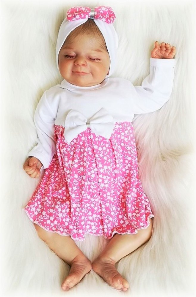 body s dlouhým rukávkem s mašličkou, sukýnkou s jemným vzorem kvítečků. Zachovává výhodu bodynka, krásně drží plenku, pohodlné oblékání i přebalování. Zapínání na ramínku i mezi nožičkami na baby druky. Neobsahuje čelenku,turban.