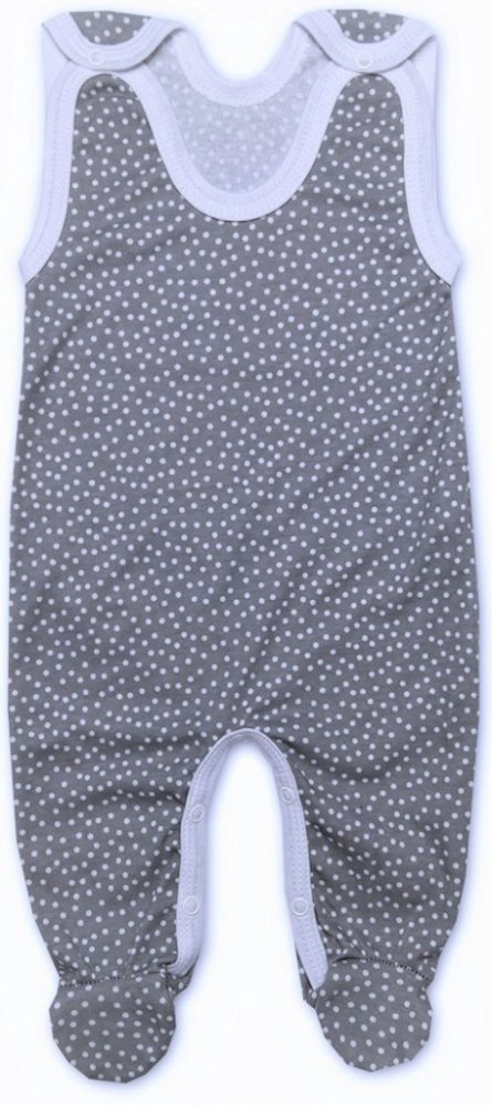 dupačky jsou vyrobeny z příjemné jemné bavlny, zapínání na ramínkách a mezi nožičkami na baby druky - usnadňuje pohodlné oblékání i přebalování miminek. Dupačky v příjemné šedé barvě s bílými puntíky a lemováním..