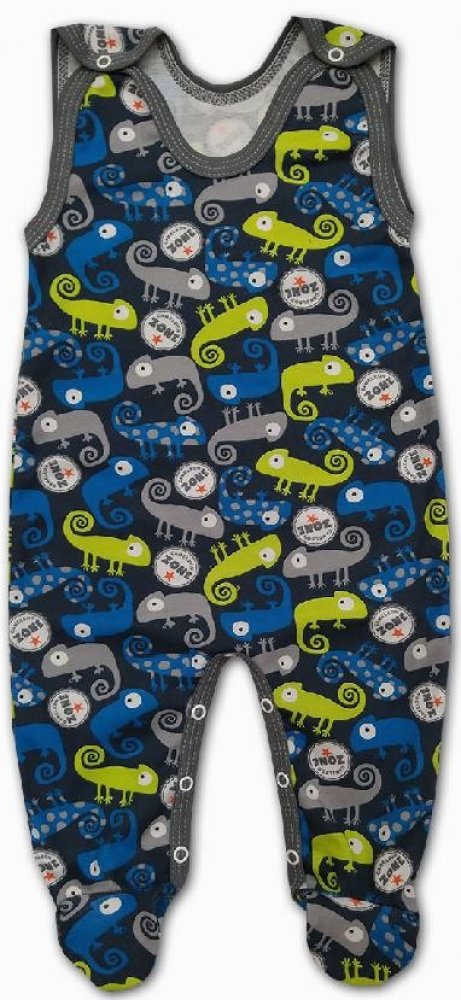 dupačky jsou vyrobeny z příjemné jemné bavlny, zapínání na ramínkách a mezi nožičkami na baby druky - usnadňuje pohodlné oblékání i přebalování miminek. Dupačky s obrázky chameleonů na tmavěšedém podkladu, šedé lemování.
