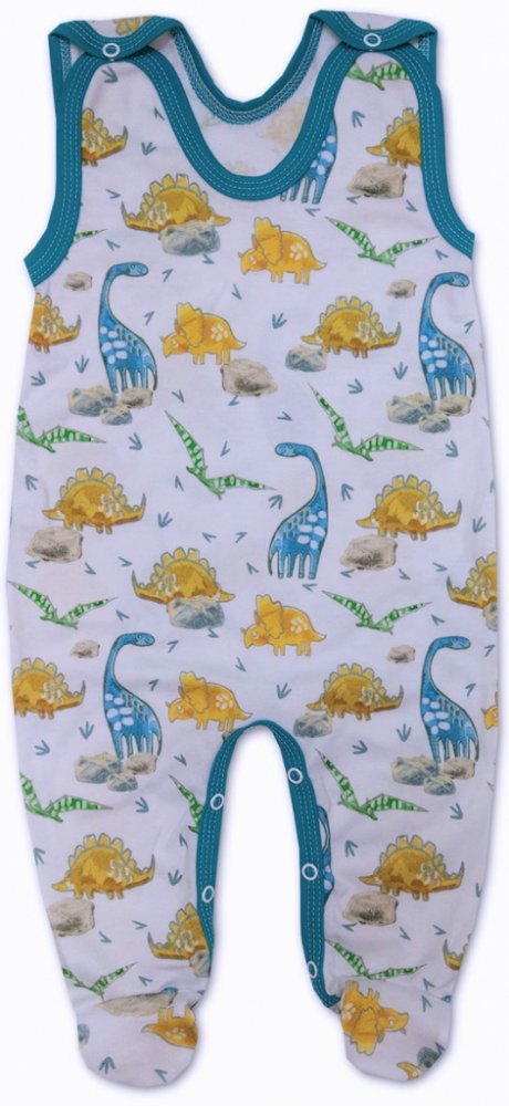 dupačky jsou vyrobeny z příjemné super jemné bavlny, zapínání na ramínkách a mezi nožičkami na baby druky - usnadňuje pohodlné oblékání i přebalování miminek. Dupačky s obrázky dinosaurů, lemování v barvě mořský tyrkys.