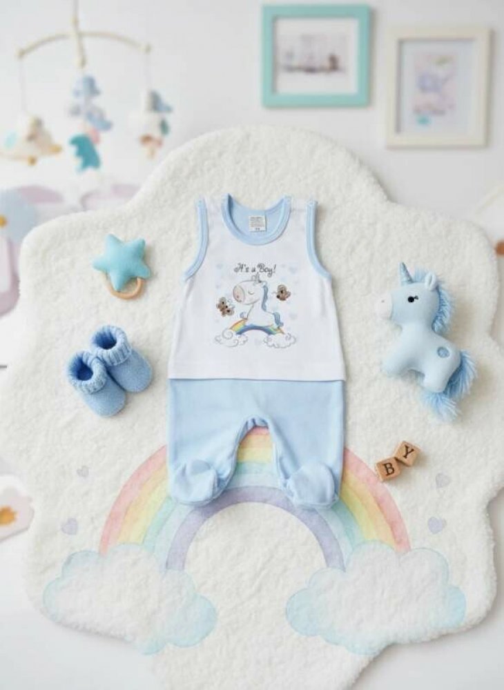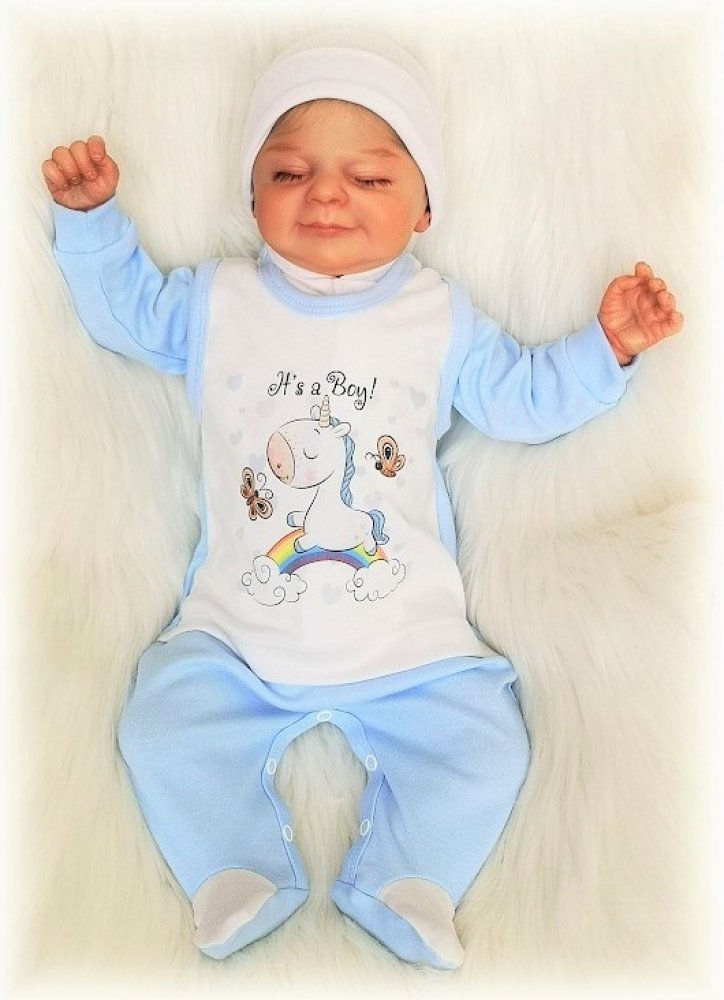 bavlněné dupačky s roztomilým jednorožcem a nápisem It's a Boy, zapínání na ramínkách i mezi nožičkami na baby druky.