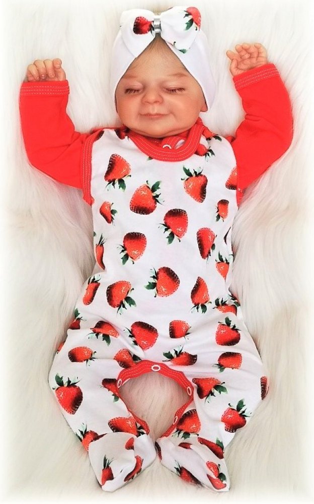 dupačky jsou vyrobené z kvalitní jemné bavlny s obrázky jahůdek, červené lemování , zapínání na ramínkách a mezi nožičkami na baby druky - usnadňuje pohodlné oblékání i přebalování novorozených miminek.