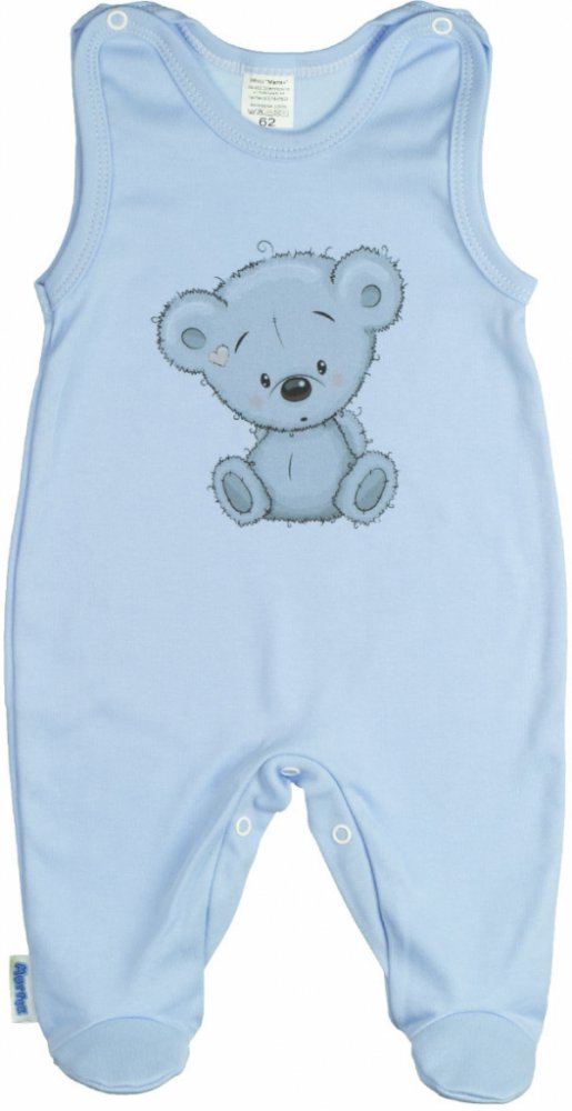 dupačky jsou vyrobeny z příjemné jemné bavlny, zapínání na ramínkách a mezi nožičkami na baby druky - usnadňuje pohodlné oblékání i přebalování miminek. Dupačky v modré barvě s zdobí obrázek medvídka.