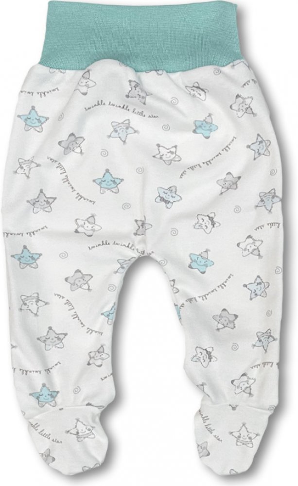 bavlněné polodupačky s obrázky roztomilých hvězdiček, široký pohodlný pružný pas v barvě máty, netlačí na bříško dítěte.