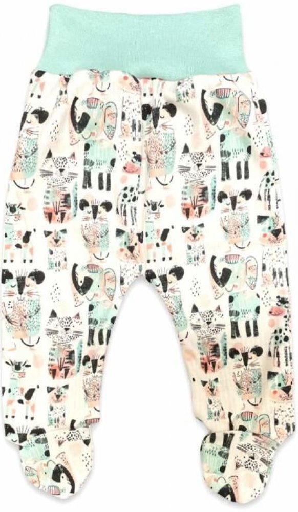 bavlněné polodupačky s obrázky veselých barevných zvířátek, široký pohodlný pružný pas v mintové barvě , netlačí na bříško dítěte.