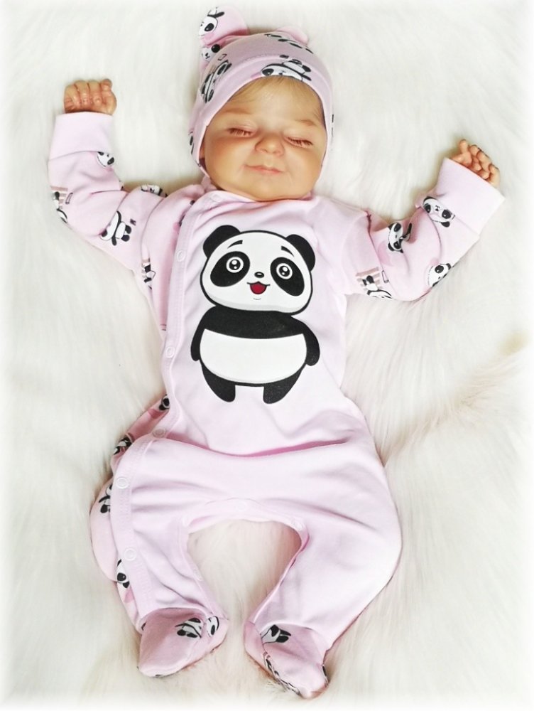 bavlněný overálek z kvalitní bavlny, na předním díle obrázek roztomilé pandy. Zapínání overalu je po celé délce i mezi nožičkami na baby druky, což velmi usnadňuje jak oblékání, tak přebalování miminka.