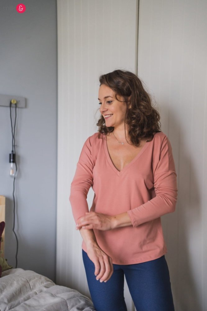 Tričko, halenka pro kojící maminky, kterou lze nosit na dva způsoby. Buď výstřihem vpředu nebo výstřihem vzadu na zádech.