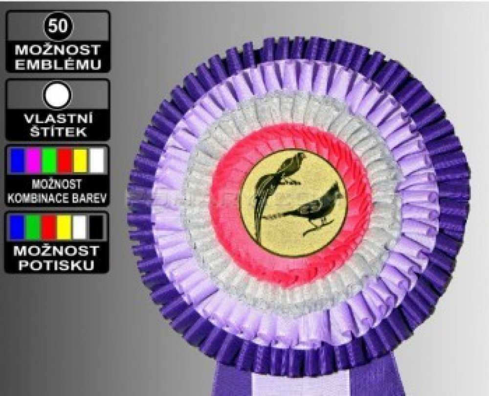 Doplnit kokardu o emblém nebo o text na kruhový štítek / dohrát logo nebo vlastní návrh štítku /, barevnou kombinaci kokardy a druhů zakončení chvostu včetně potisku stuhy můžete zadat v dalším kroku objednávky po kliknutí na tlačítko PŘIDAT DOPLŇKY.